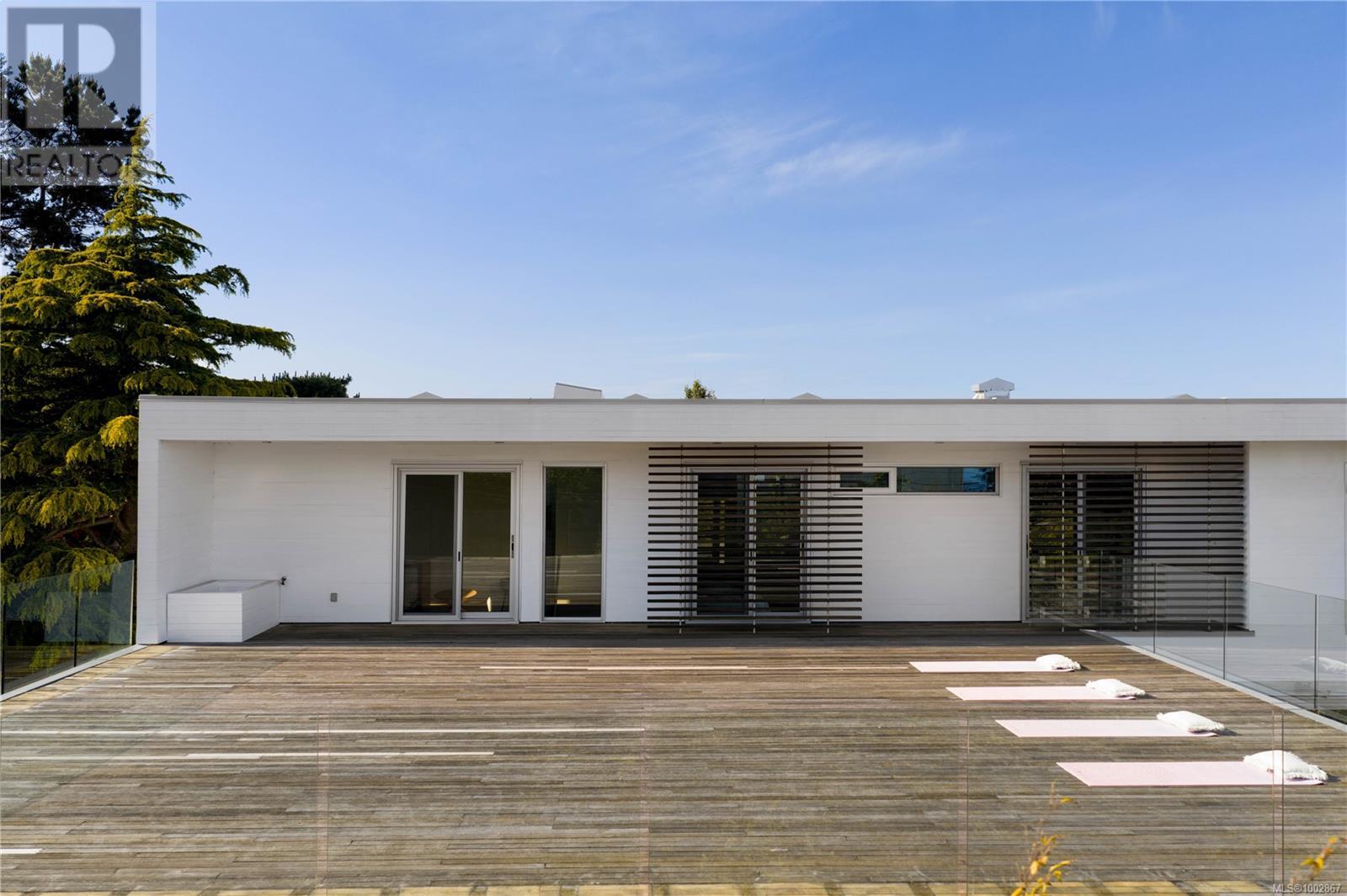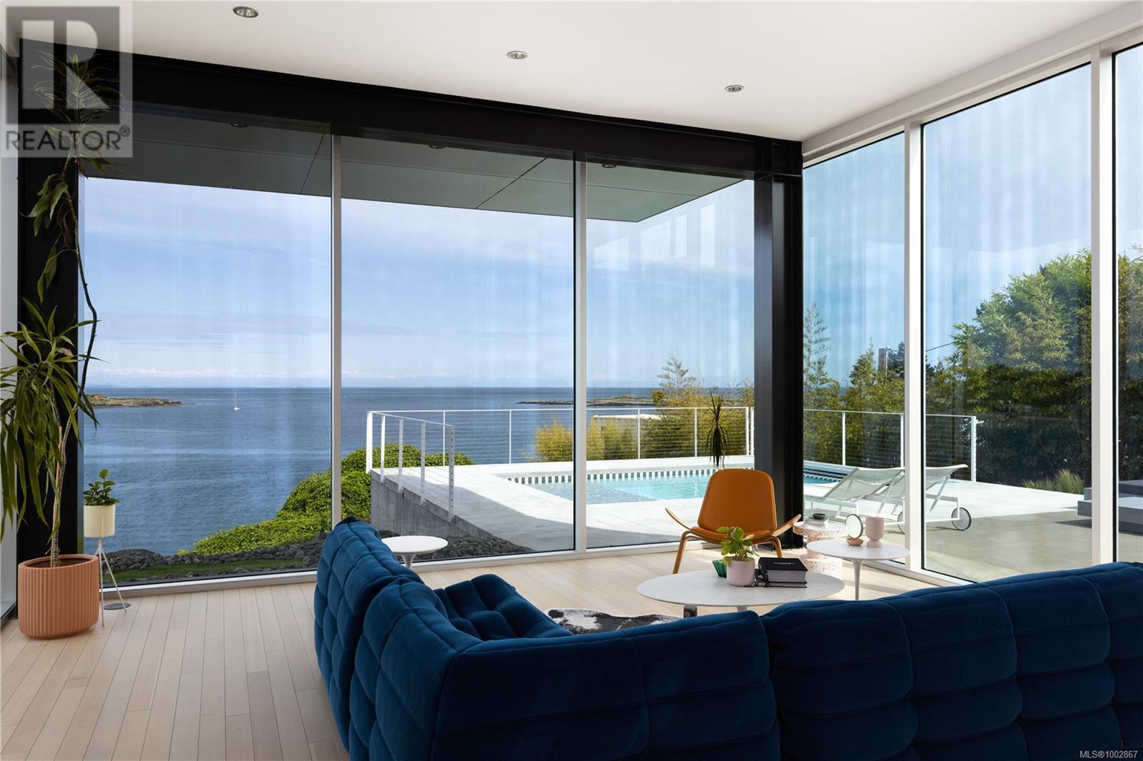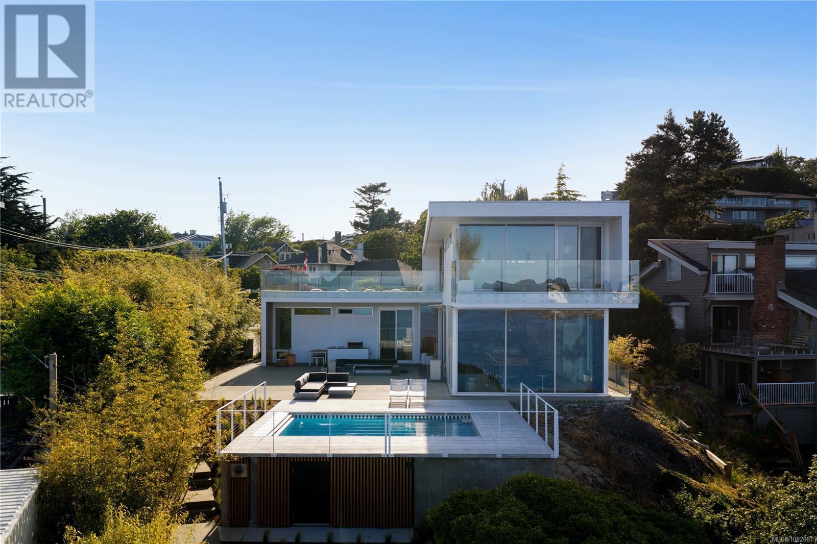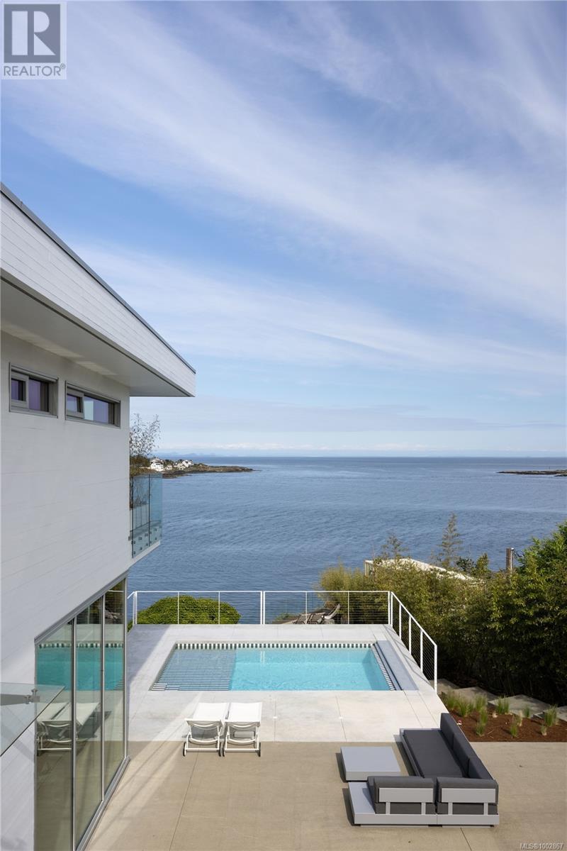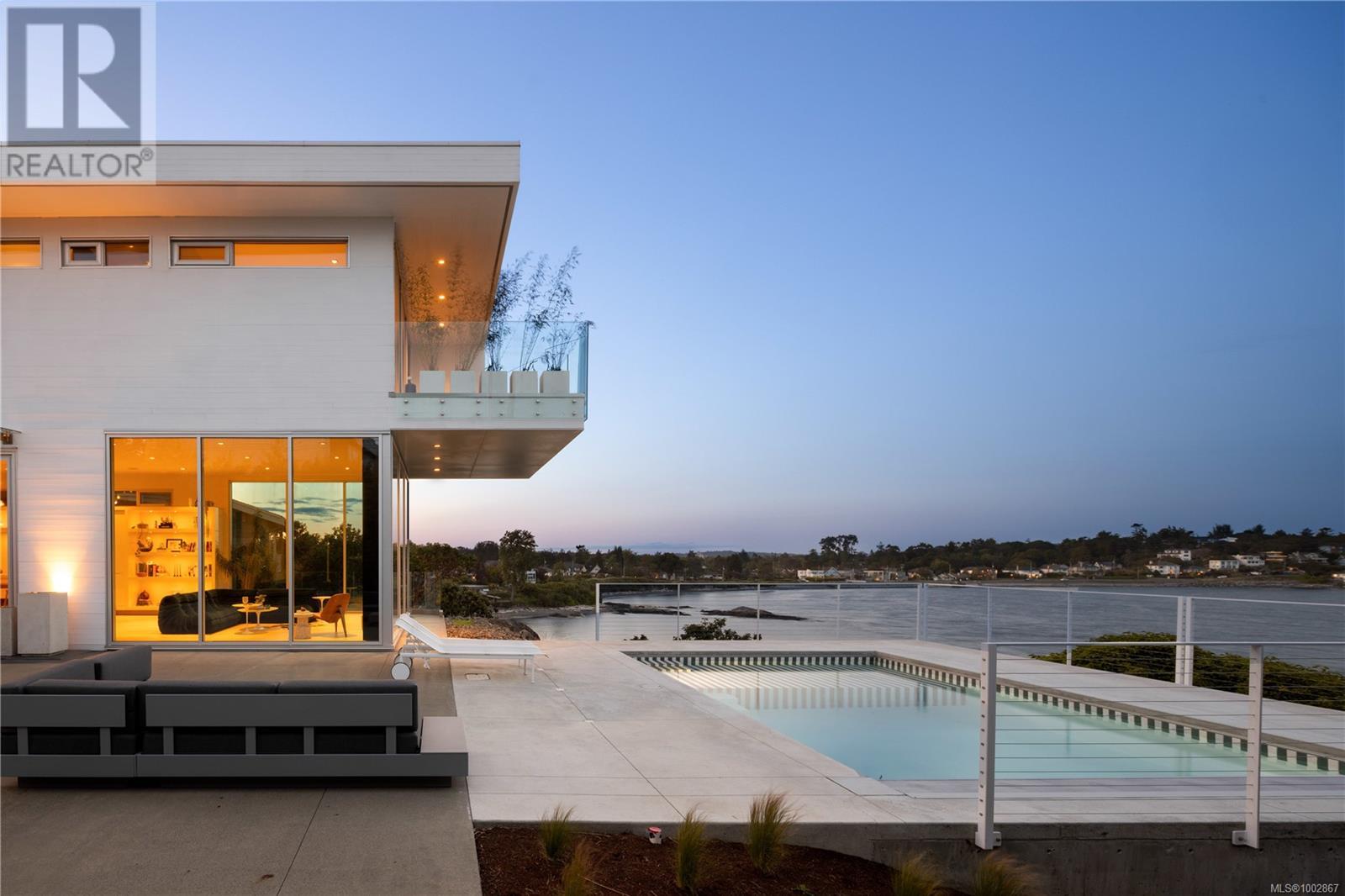 A striking example of modern minimalism perched on the southern edge of Oak Bay, this custom-built oceanfront residence offers panoramic views from nearly every room. Designed for seamless indoor-outdoor living, the main floor boasts 11’ ceilings and expansive glass walls that open onto multiple patios, a sleek swimming pool, and a dedicated gym/studio. The chef’s kitchen features integrated appliances and a massive island perfect for entertaining. Upstairs, the serene primary suite includes a walk-in closet, spa-like ensuite, and private covered balcony. Also accessible from the upper floor is the expansive rooftop deck - perfect for yoga, stargazing, or sunset gatherings. Radiant in-floor heating, custom millwork, and architectural detailing throughout provide comfort and sophistication. Tucked on a private corner lot with a 2-car garage, carport, and lush landscaping, this is coastal living redefined: luxurious, tranquil, and effortlessly connected to nature. (id:2469)