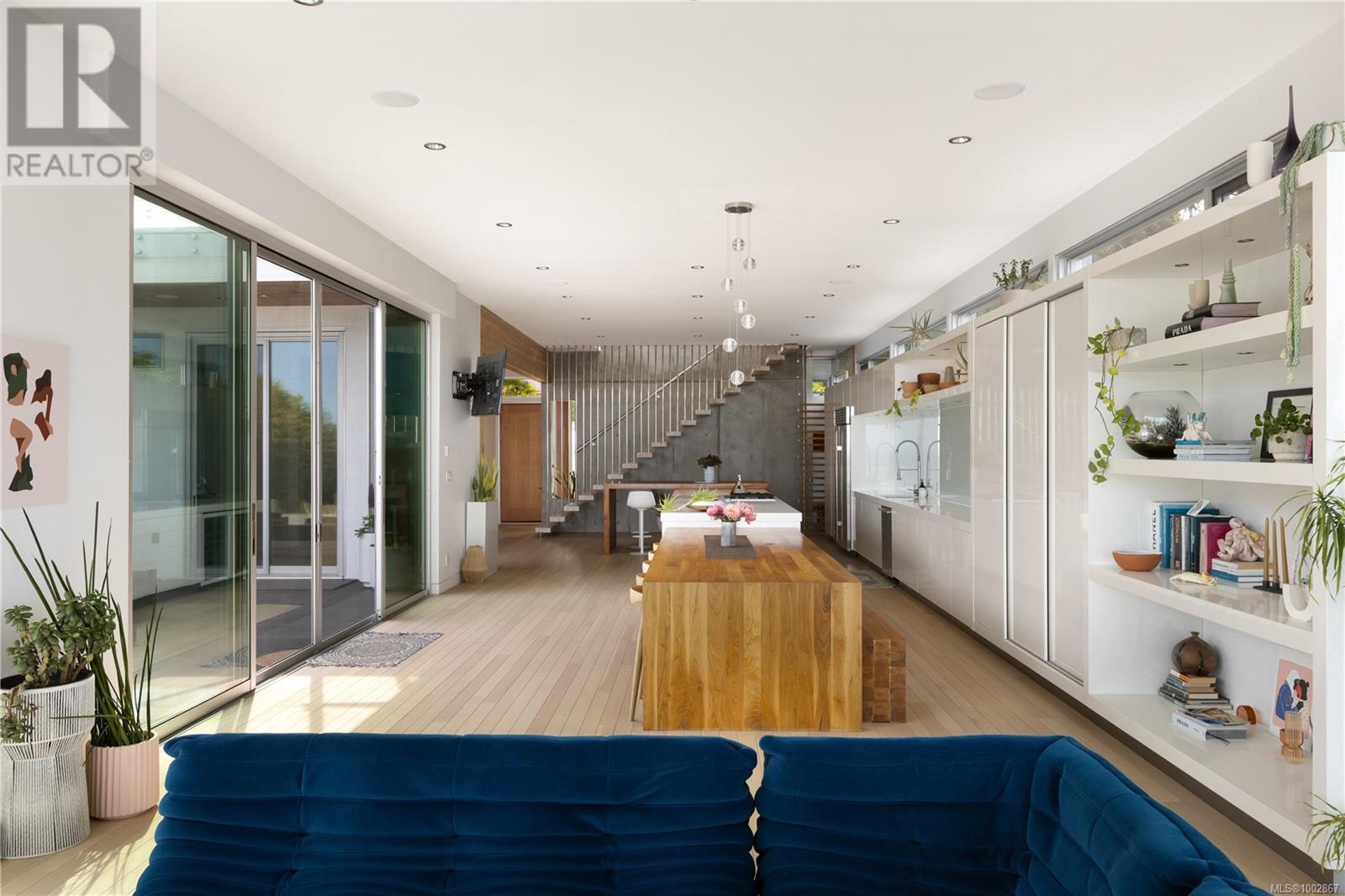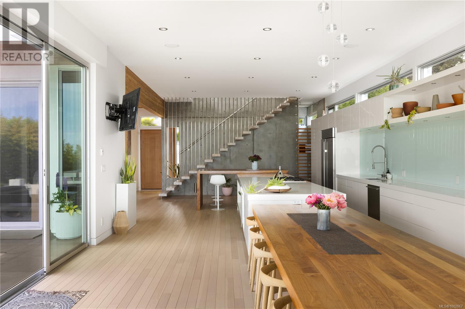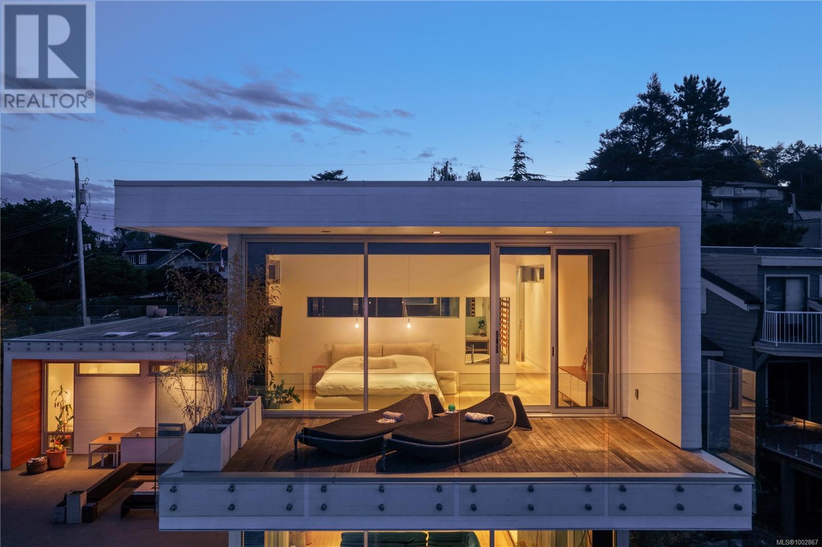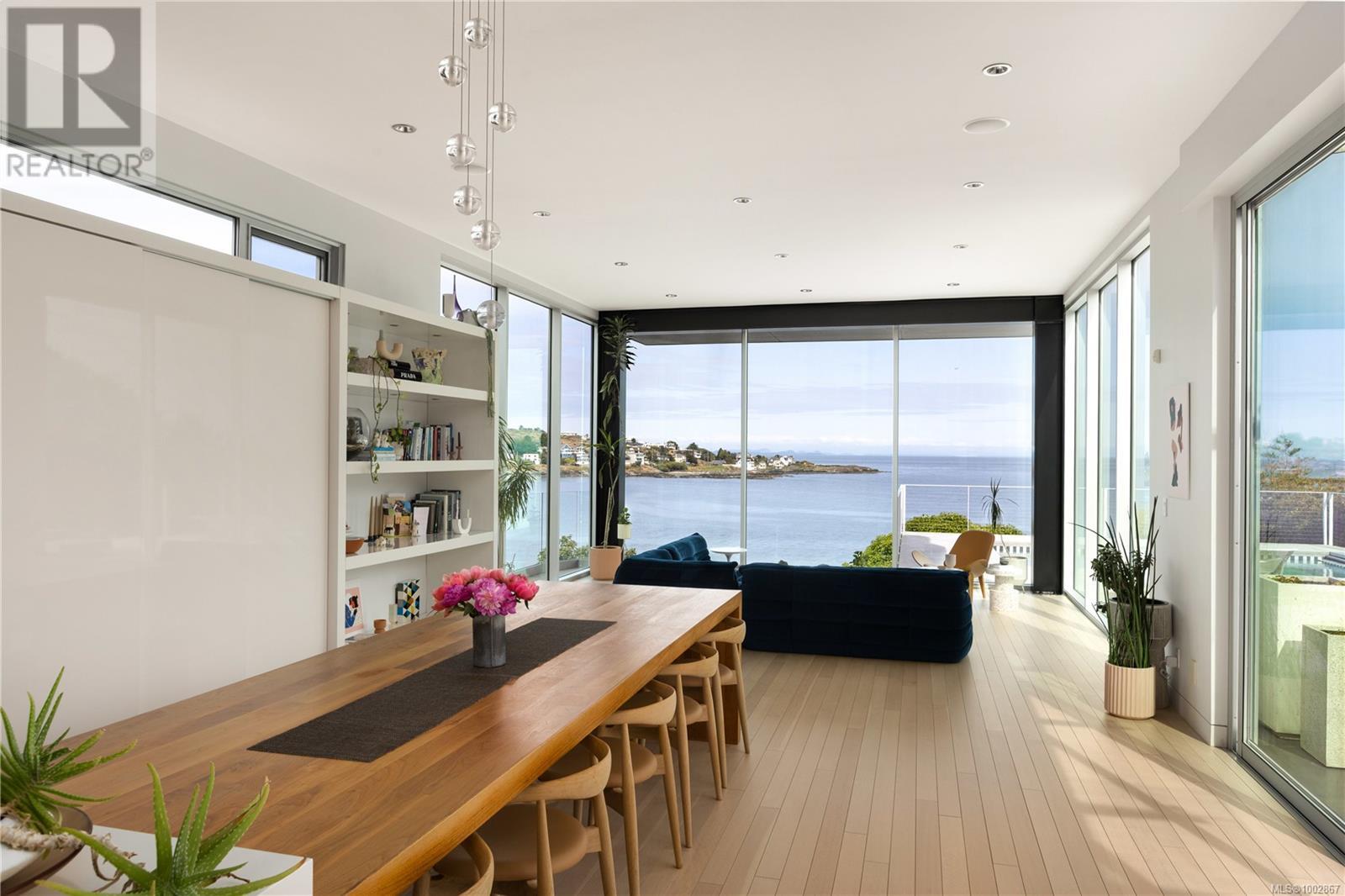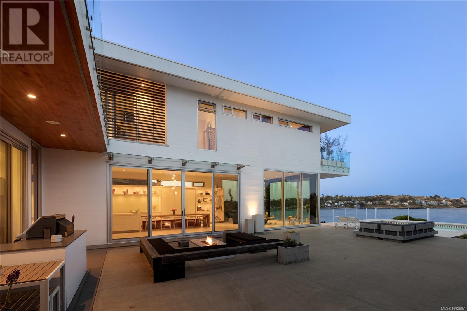 A striking example of modern minimalism perched on the southern edge of Oak Bay, this custom-built oceanfront residence offers panoramic views from nearly every room. Designed for seamless indoor-outdoor living, the main floor boasts 11’ ceilings and expansive glass walls that open onto multiple patios, a sleek swimming pool, and a dedicated gym/studio. The chef’s kitchen features integrated appliances and a massive island perfect for entertaining. Upstairs, the serene primary suite includes a walk-in closet, spa-like ensuite, and private covered balcony. Also accessible from the upper floor is the expansive rooftop deck - perfect for yoga, stargazing, or sunset gatherings. Radiant in-floor heating, custom millwork, and architectural detailing throughout provide comfort and sophistication. Tucked on a private corner lot with a 2-car garage, carport, and lush landscaping, this is coastal living redefined: luxurious, tranquil, and effortlessly connected to nature. (id:2469)