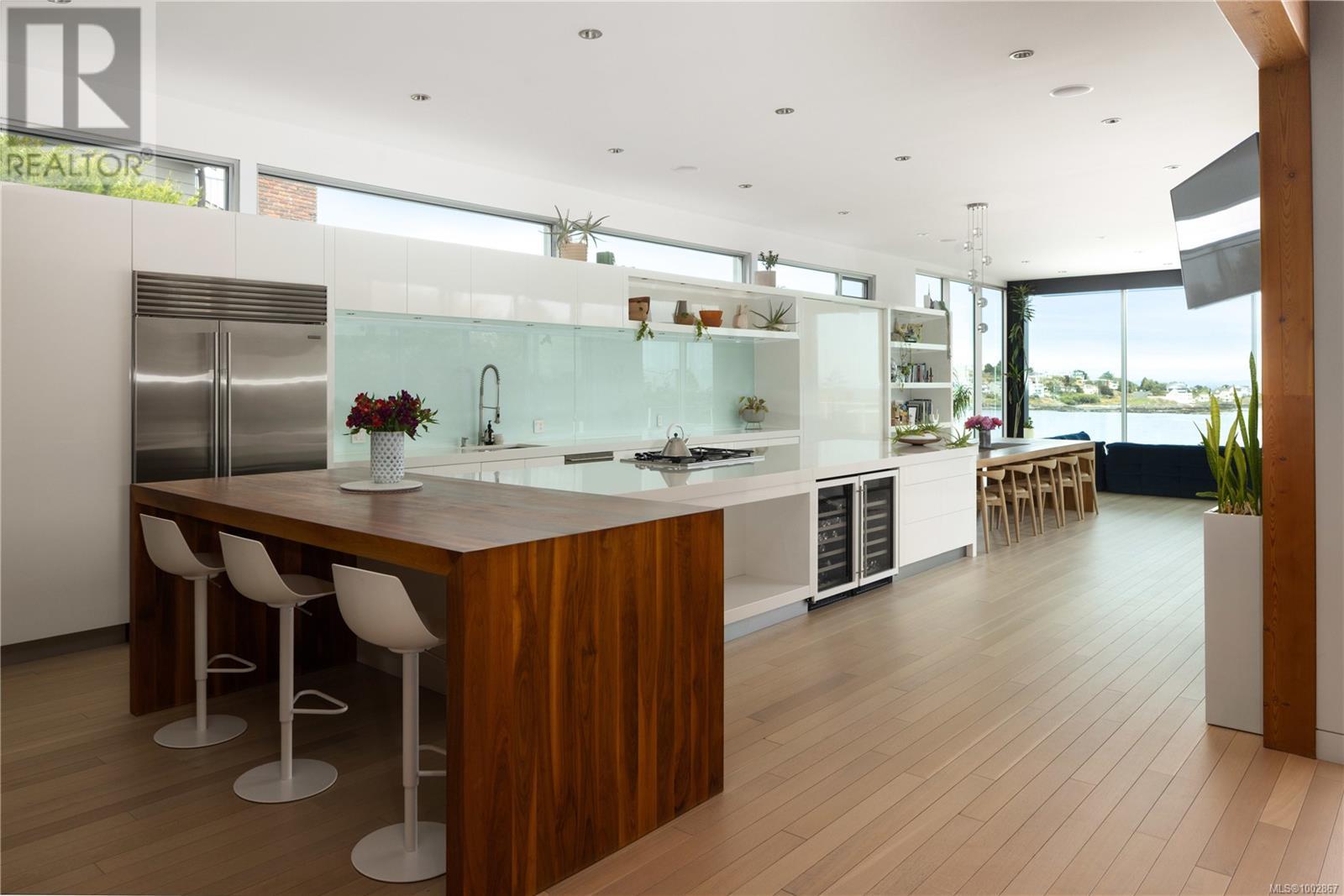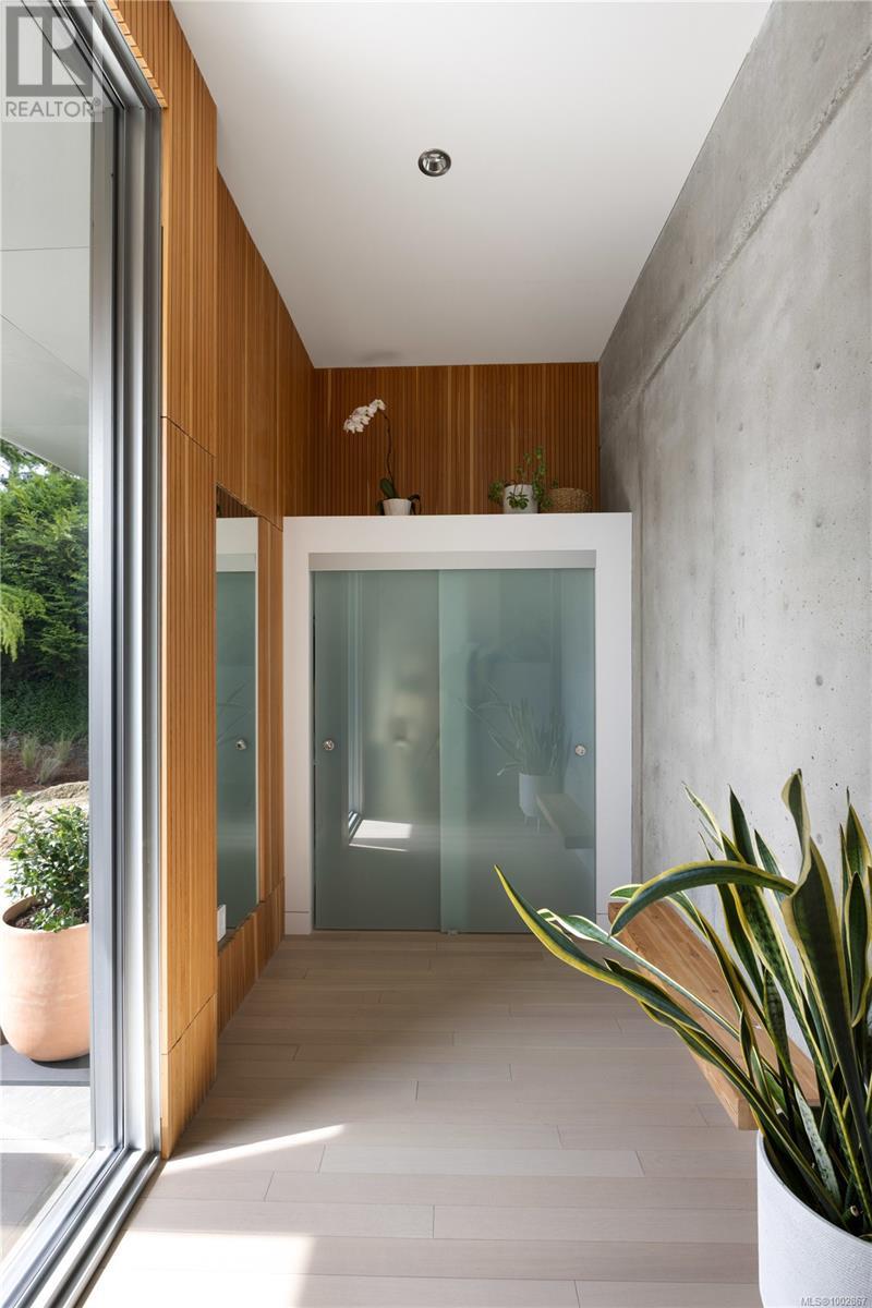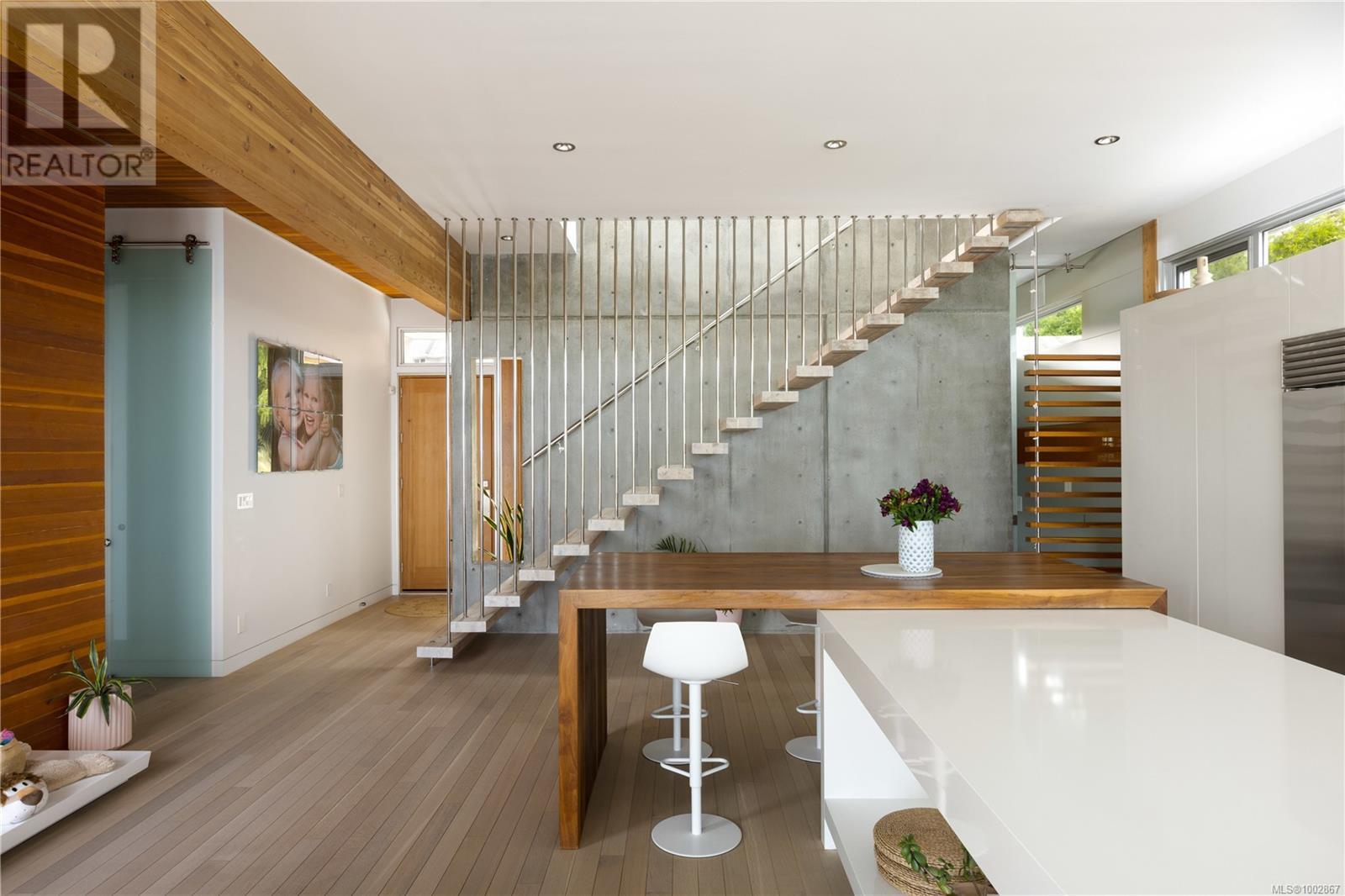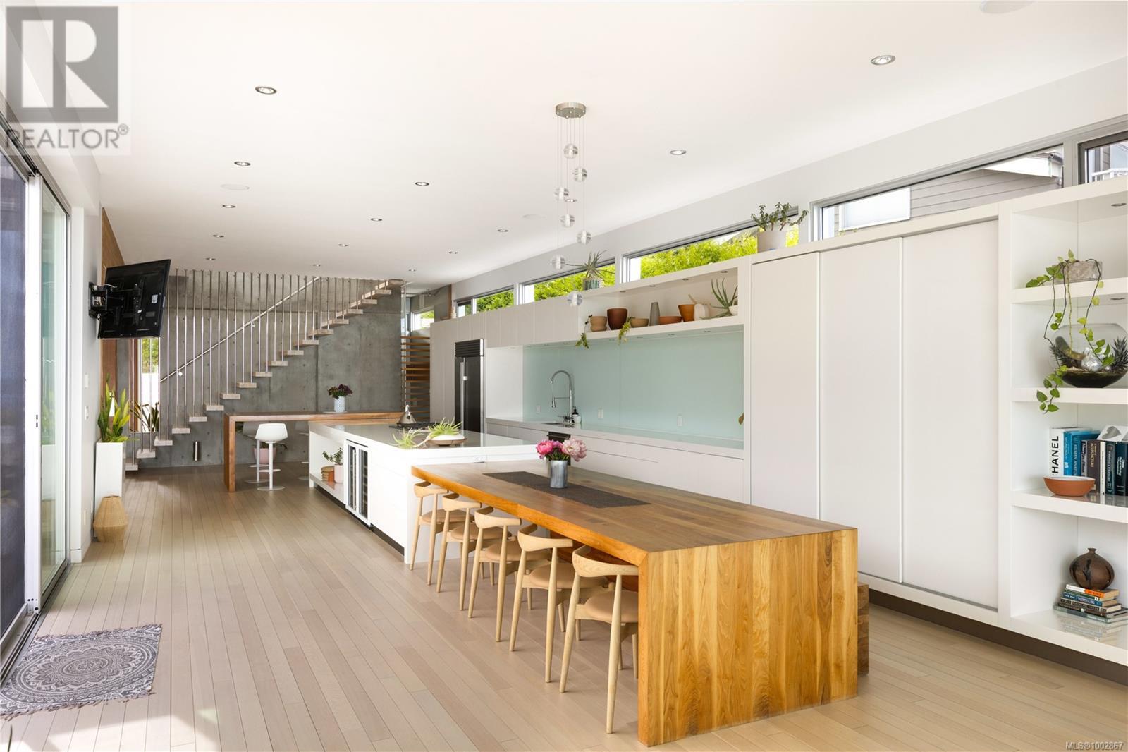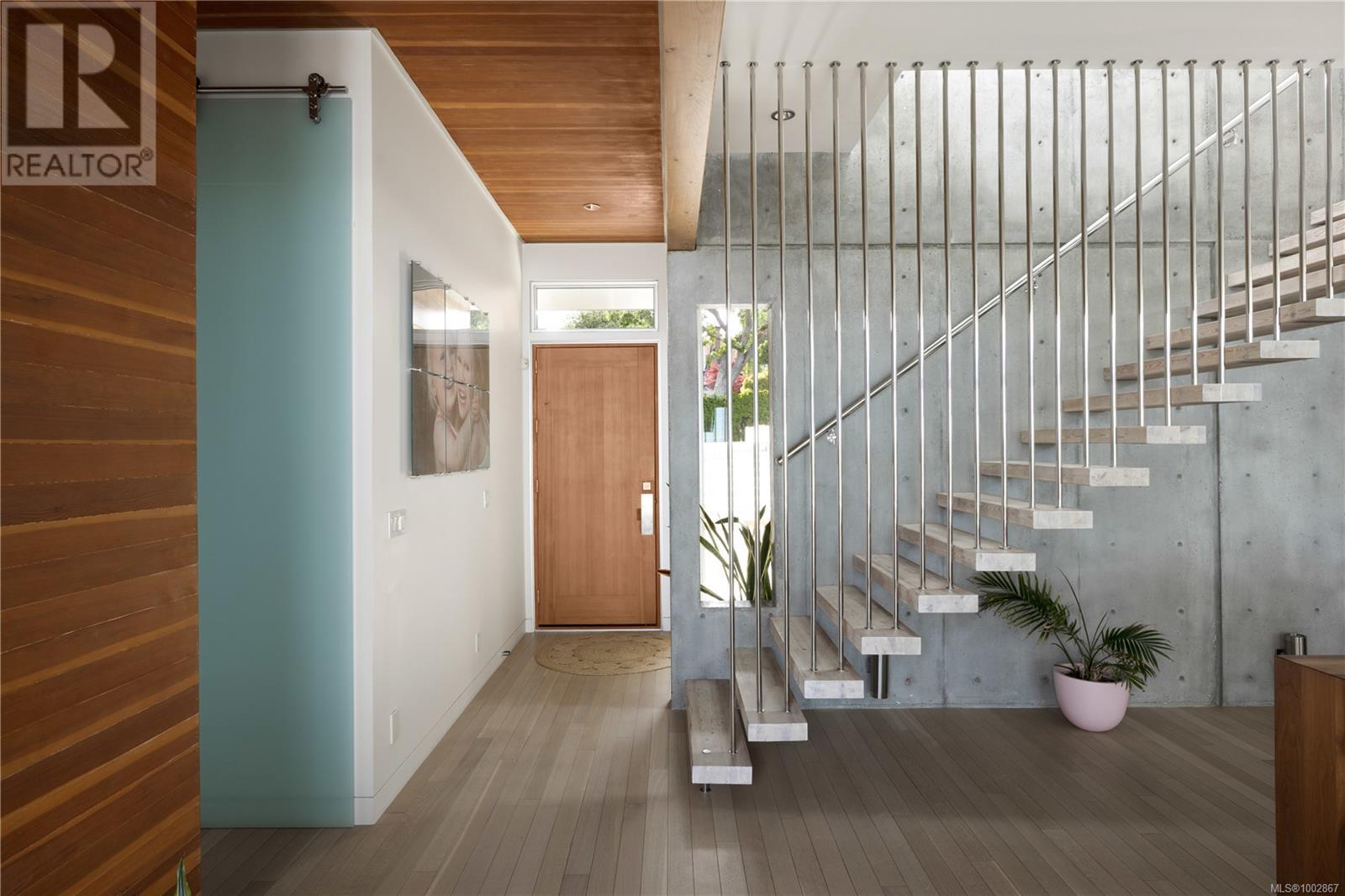 A striking example of modern minimalism perched on the southern edge of Oak Bay, this custom-built oceanfront residence offers panoramic views from nearly every room. Designed for seamless indoor-outdoor living, the main floor boasts 11’ ceilings and expansive glass walls that open onto multiple patios, a sleek swimming pool, and a dedicated gym/studio. The chef’s kitchen features integrated appliances and a massive island perfect for entertaining. Upstairs, the serene primary suite includes a walk-in closet, spa-like ensuite, and private covered balcony. Also accessible from the upper floor is the expansive rooftop deck - perfect for yoga, stargazing, or sunset gatherings. Radiant in-floor heating, custom millwork, and architectural detailing throughout provide comfort and sophistication. Tucked on a private corner lot with a 2-car garage, carport, and lush landscaping, this is coastal living redefined: luxurious, tranquil, and effortlessly connected to nature. (id:2469)