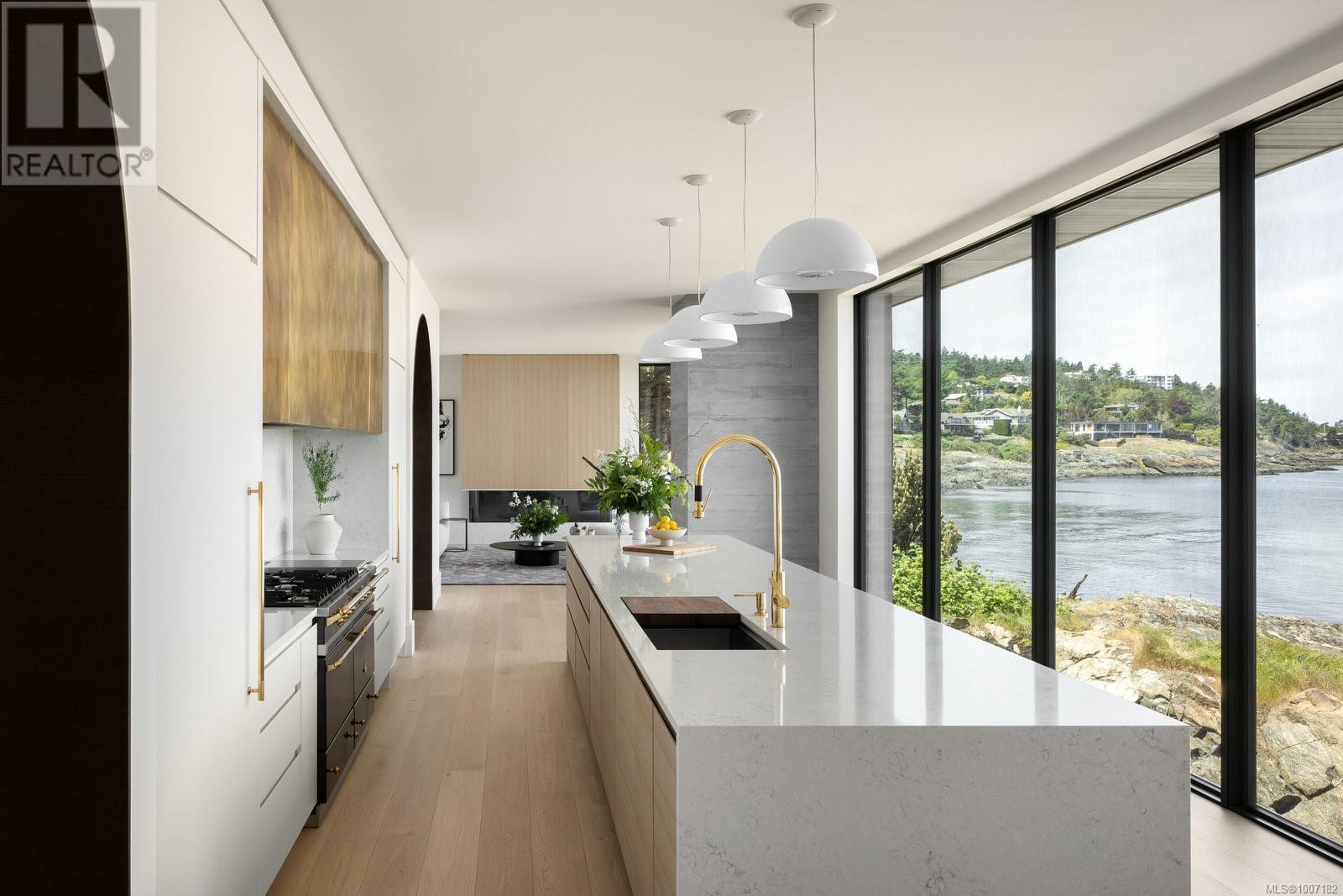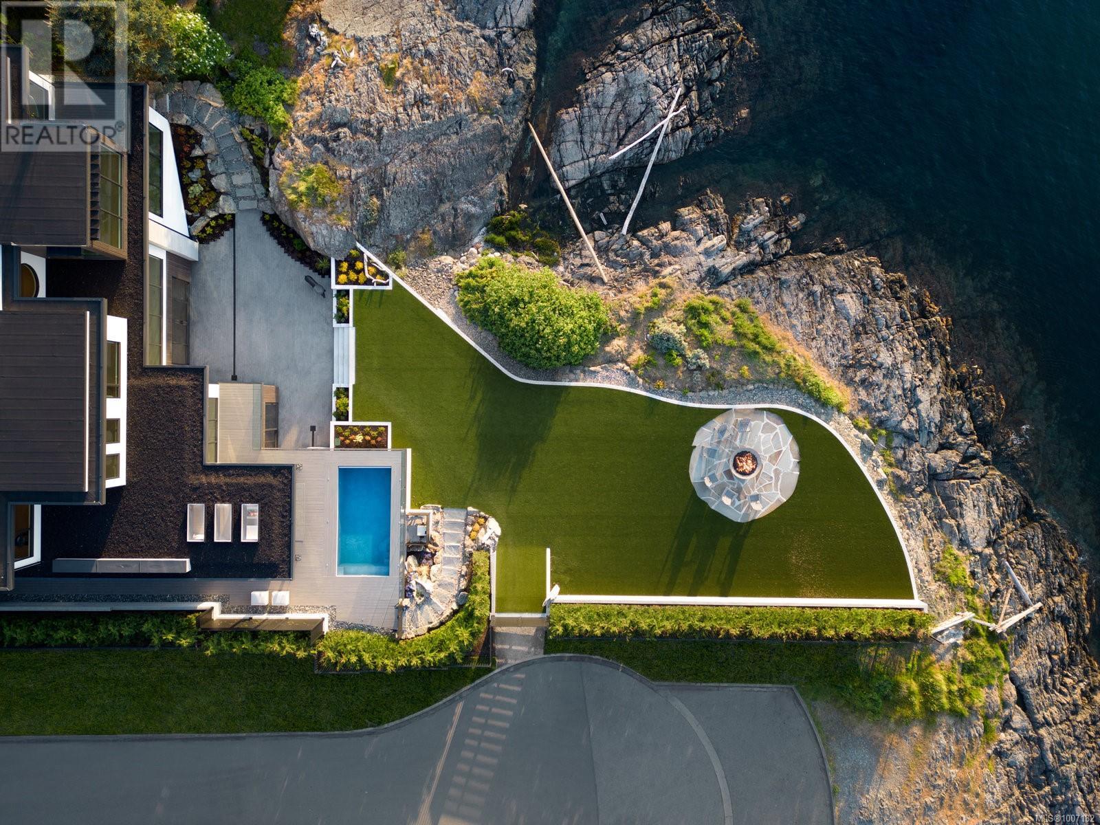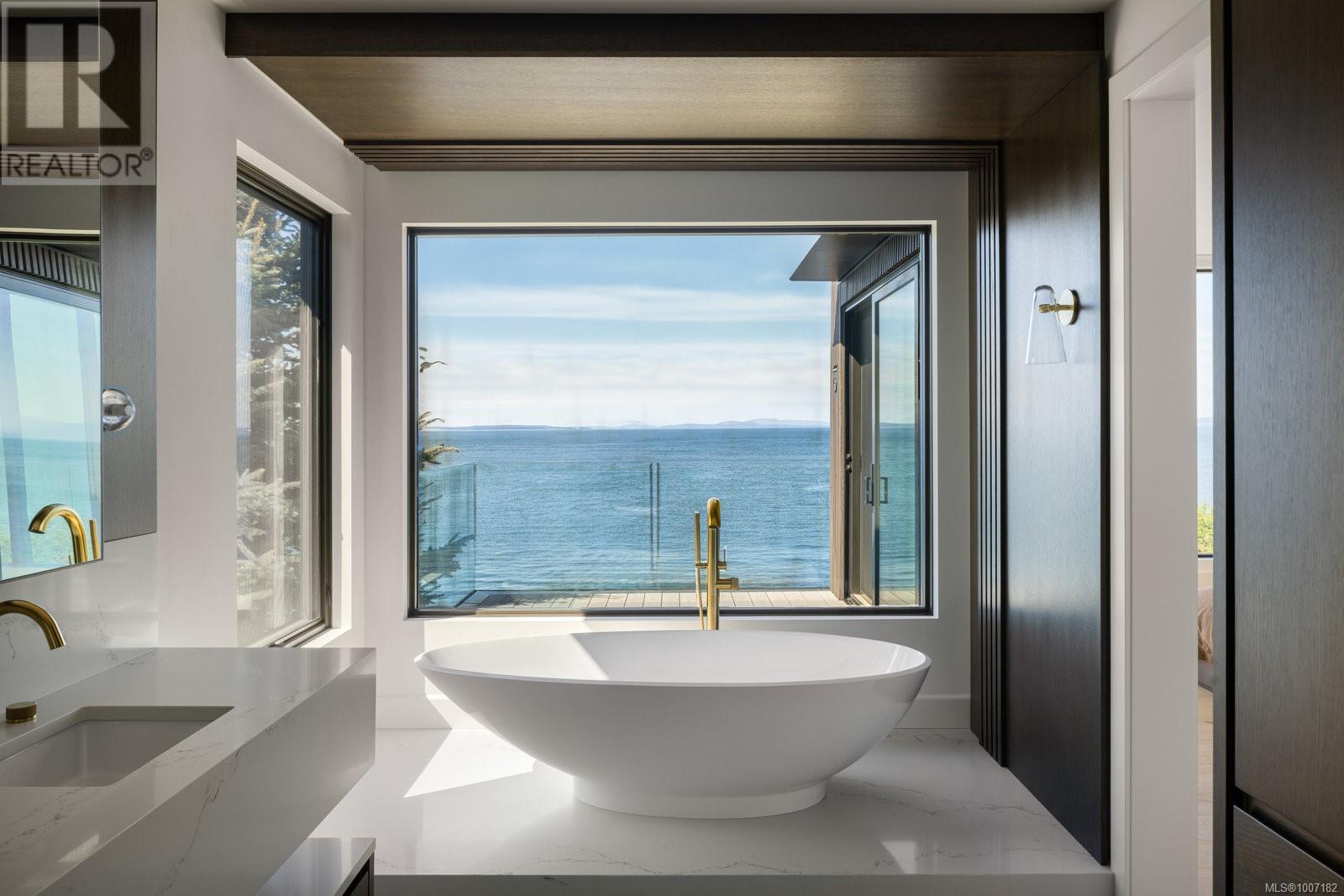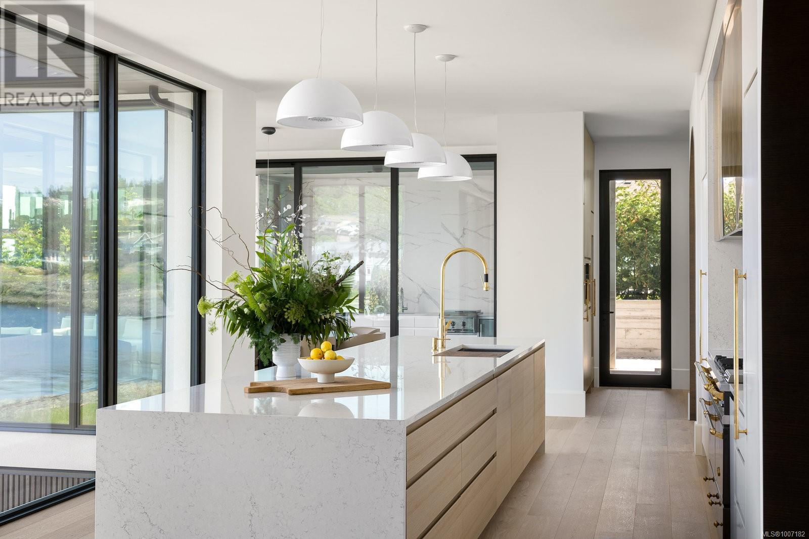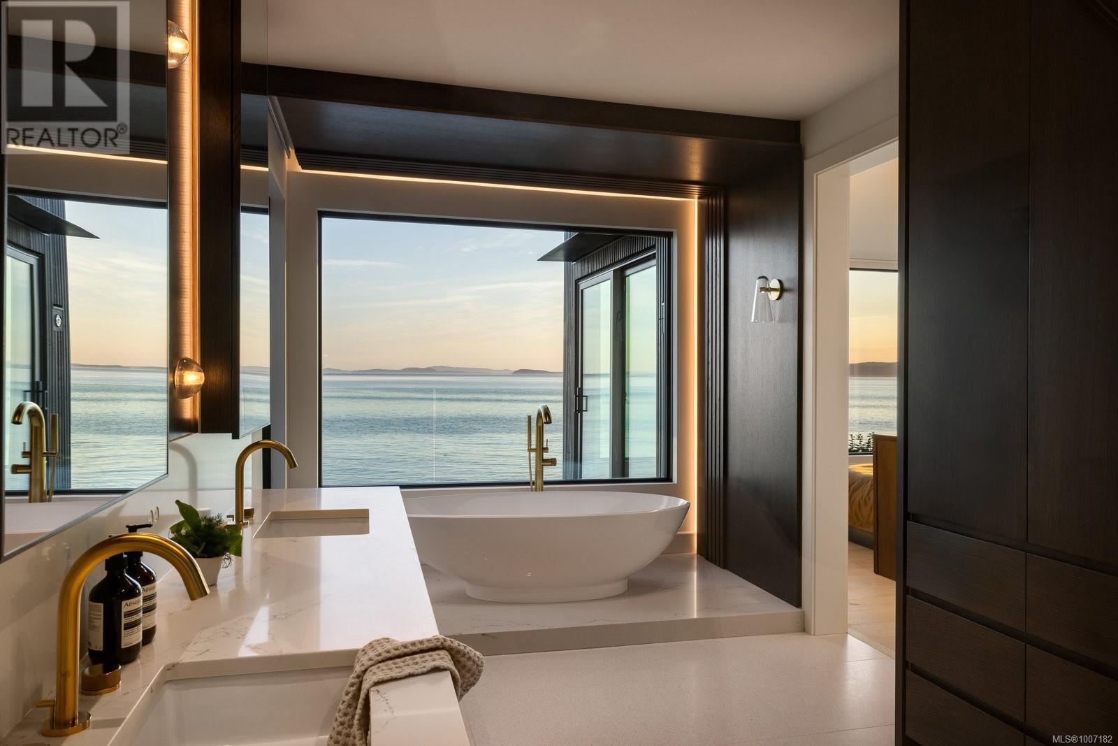Experience Unparalleled Luxury at Vista del Mare. Perfectly positioned on over half an acre of prime waterfront in the prestigious Ten Mile Point, this architectural masterpiece by Robert Blaney, brought to life by Terry Johal Developments, promises to leave you breathless. Winner of 4 CARE Awards, including Best Single Family Detached Home, Best Innovative Feature, Best Primary Suite and Best Custom Millwork. Step into grandeur with 10-foot ceilings and a show-stopping steel and white oak floating spiral staircase that sets the tone for the rest of this captivating home. The expansive floor-to-ceiling windows on all three levels not only flood the interior with natural light but also offer uninterrupted views of Haro Strait and San Juan Island, making every room a visual delight. The neutral colour palette, accented by targeted designer lighting, creates an ambiance that is both clean and invigorating. The main floor's open-plan design maximizes these ocean views, seamlessly integrating the living, dining, and kitchen areas for effortless entertaining and everyday living. The sky-lit covered patio, adjacent to your complete outdoor kitchen with a deluxe Hestan grill and Fontana Forni pizza oven - imported from Italy- allows for al fresco dining with the backdrop of stunning seascapes, with the occasional killer whale and aurora borealis sighting. Enjoy a dip in the heated pool, followed by a rinse in the outdoor shower. Car enthusiasts will appreciate the attached three-car garage, equipped with two vehicle elevators. Above the garage, a separate, well-insulated guest suite offers a private living area, bedroom, and full bath. (id:2469)