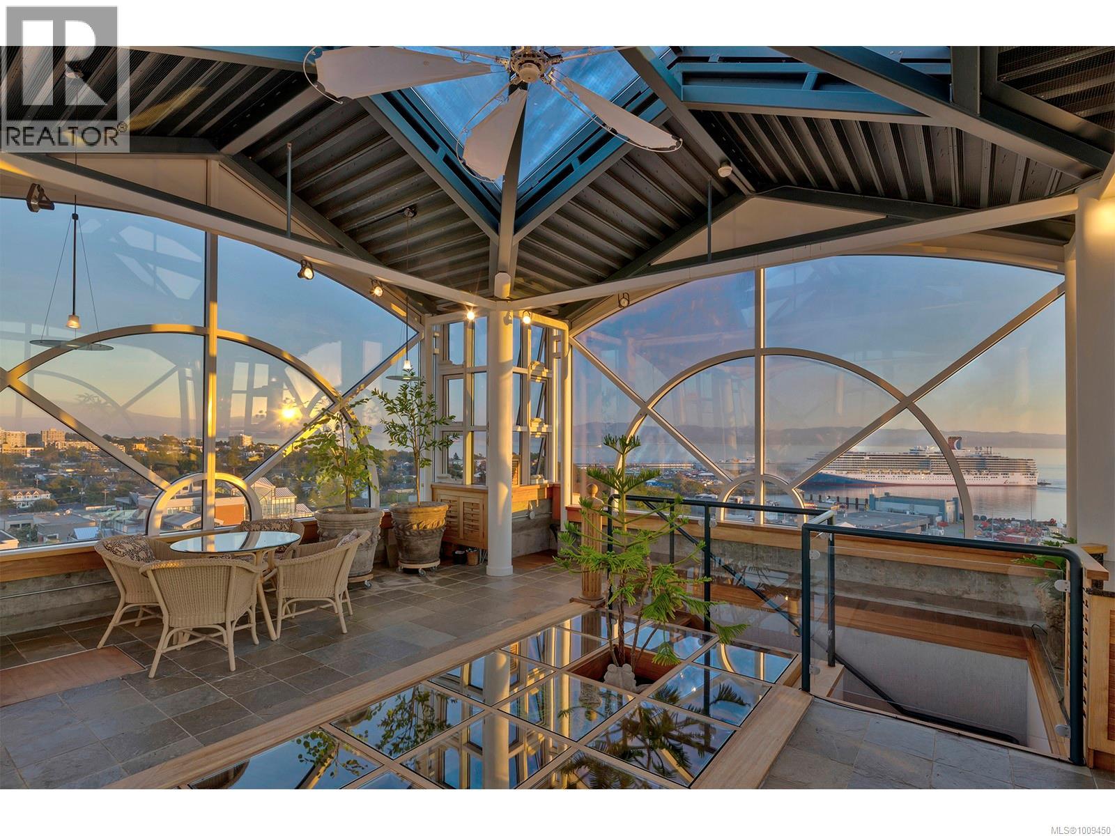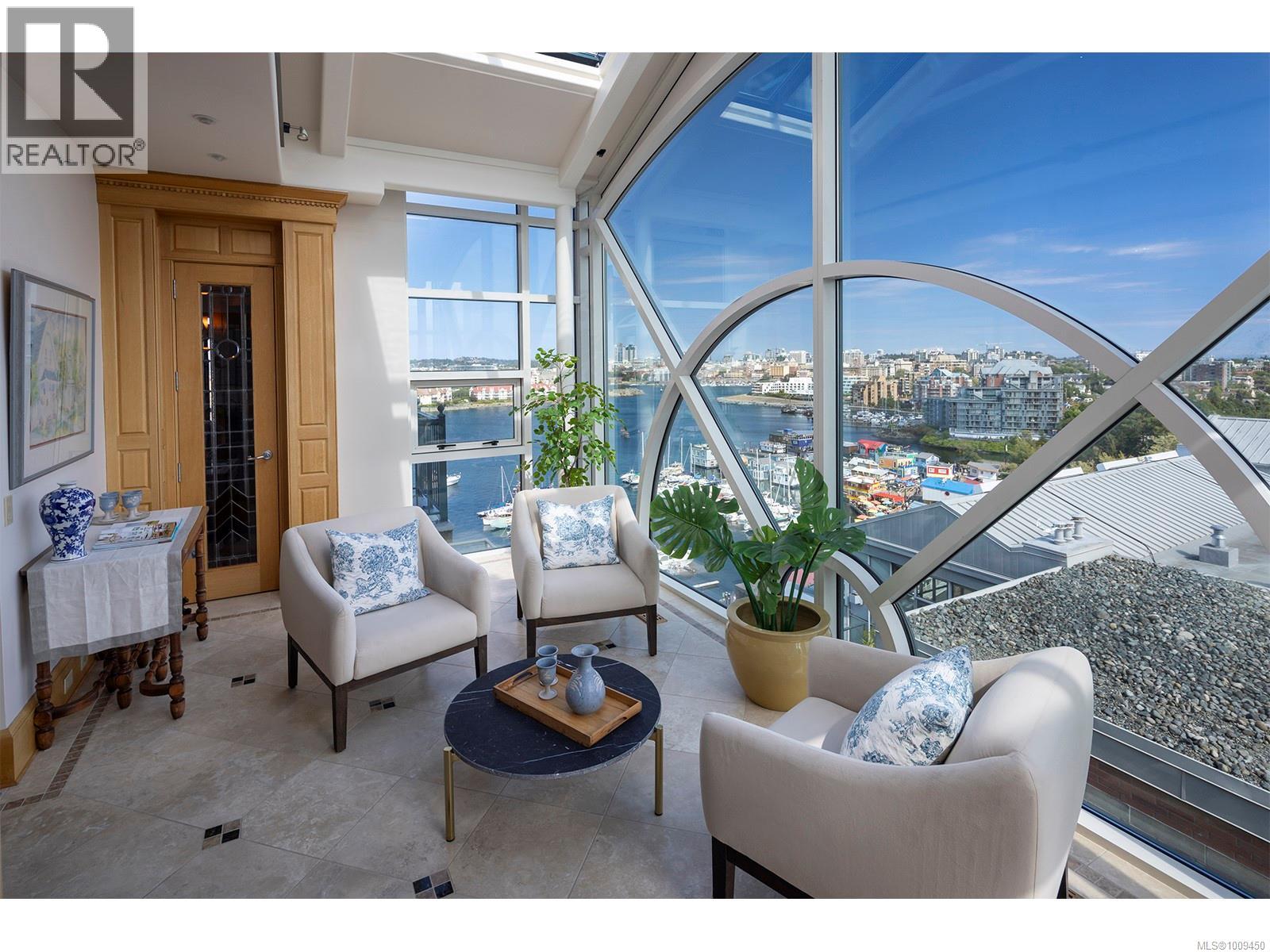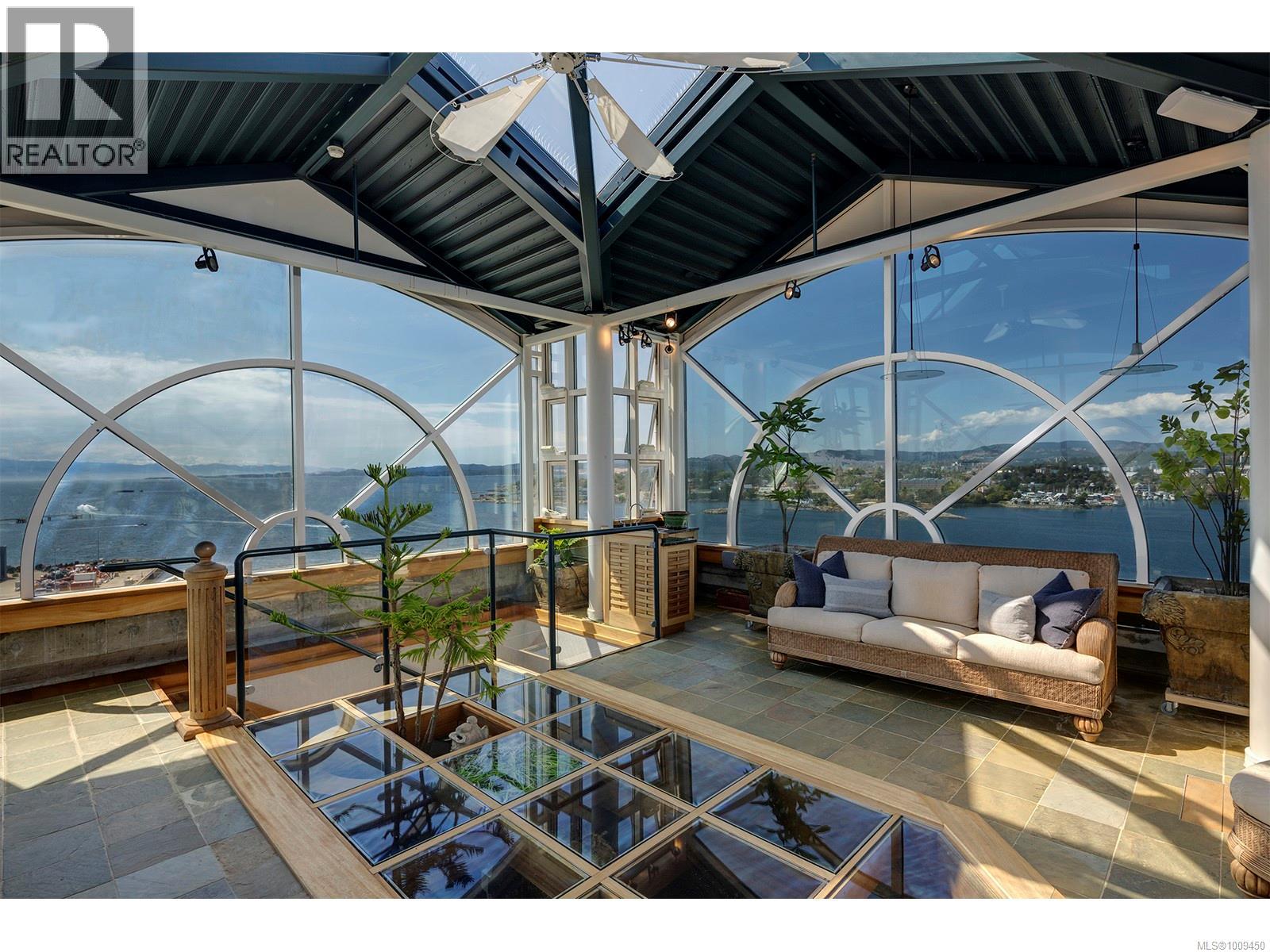 Welcome to this iconic waterfront Shoal Point penthouse, high above Victoria’s beautiful Inner Harbour, with 360 degree views from harbour across the Juan de Fuca Strait toward the snow-capped Olympic Mts.! With fine craftsmanship evident throughout, this one-owner executive suite was designed for the developer’s personal use, achieving its goal of providing an “inspirational” lifestyle in beautiful Victoria. Upon stepping off your private elevator, the foyer greets you with one of this home’s nine fireplaces and leads you to a welcoming sunroom. Custom white oak mill work and paneling and floor-to-ceiling Palladian windows throughout, truly set this home apart. The gourmet kitchen includes hi-end appliances, a second prep station, pantry, casual eating area and floor-to-ceiling windows. The living room features heights of over 23 feet in some areas with a galleried second floor, and the formal dining room with fireplace can accommodate grand-scale entertaining! This level also includes a beautiful wood-paneled study/den with fireplace, guest bedroom with ensuite plus a 2-pce bath.. An internal elevator takes you to the primary bedroom level with dual his and hers ensuite bathrooms, dressing rooms and expansive ocean views, two balconies, hot tub and laundry room. A 360-degree glass observation level comprises the third story of the home, including a glass-covered fishpond and a huge ‘wow’ factor in every direction! Several terraces, some of which are covered, offer a variety of options for outdoor living. This home includes two large storage rooms (one used as a temperature-controlled wine cellar) and three underground parking spaces. Shoal Point is built to exacting standards (R 2000 building); air conditioning and earthquake protection. Other building amenities incl. concierge service, fitness centre with indoor pool and weight/exercise room, putting green, and bicycle & kayak storage. Just steps from Victoria's incredible Inner Harbour (id:2469)