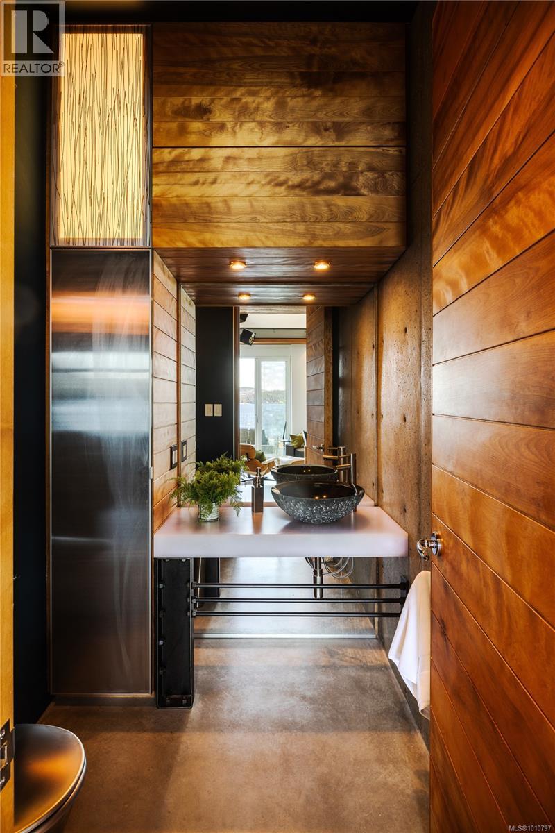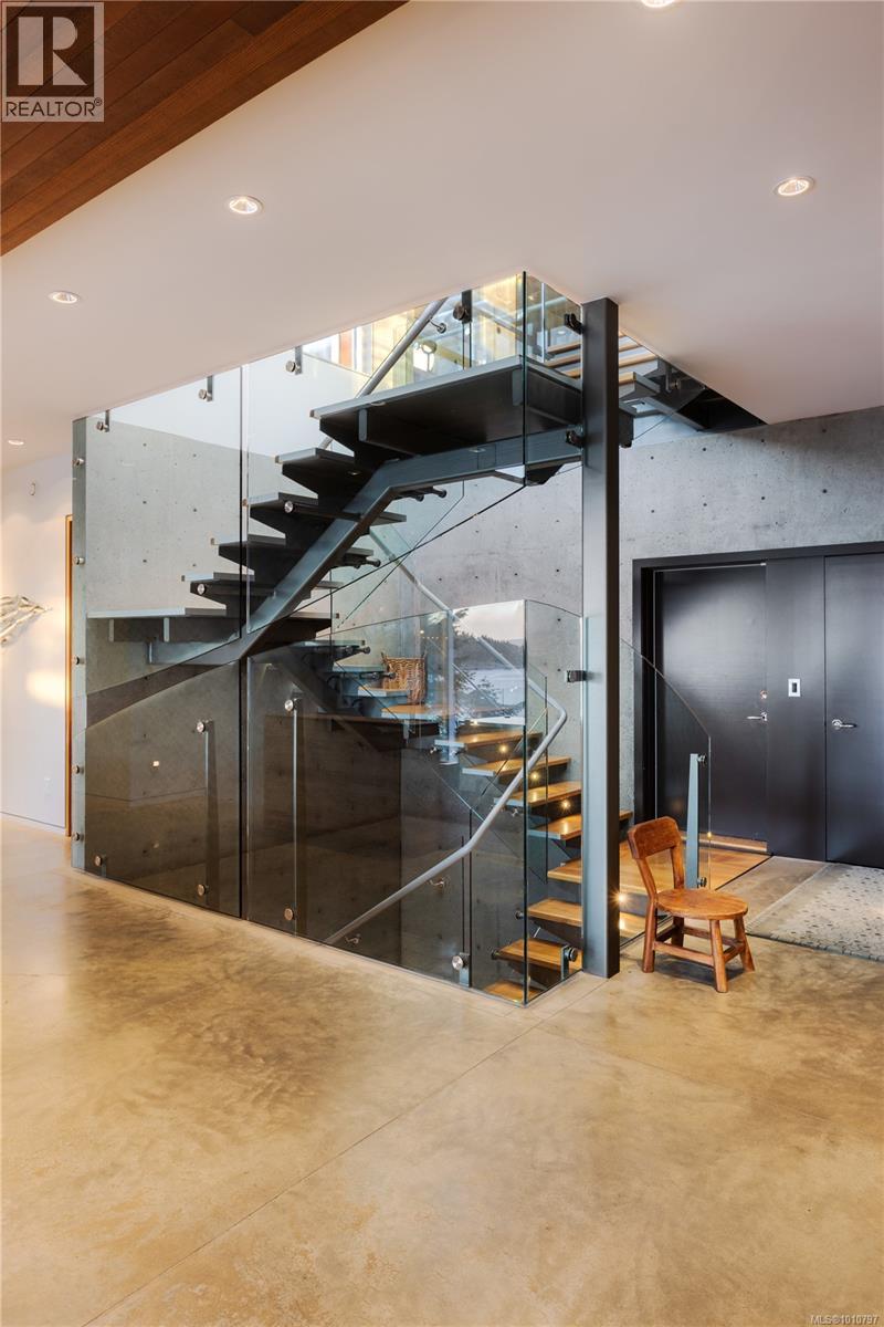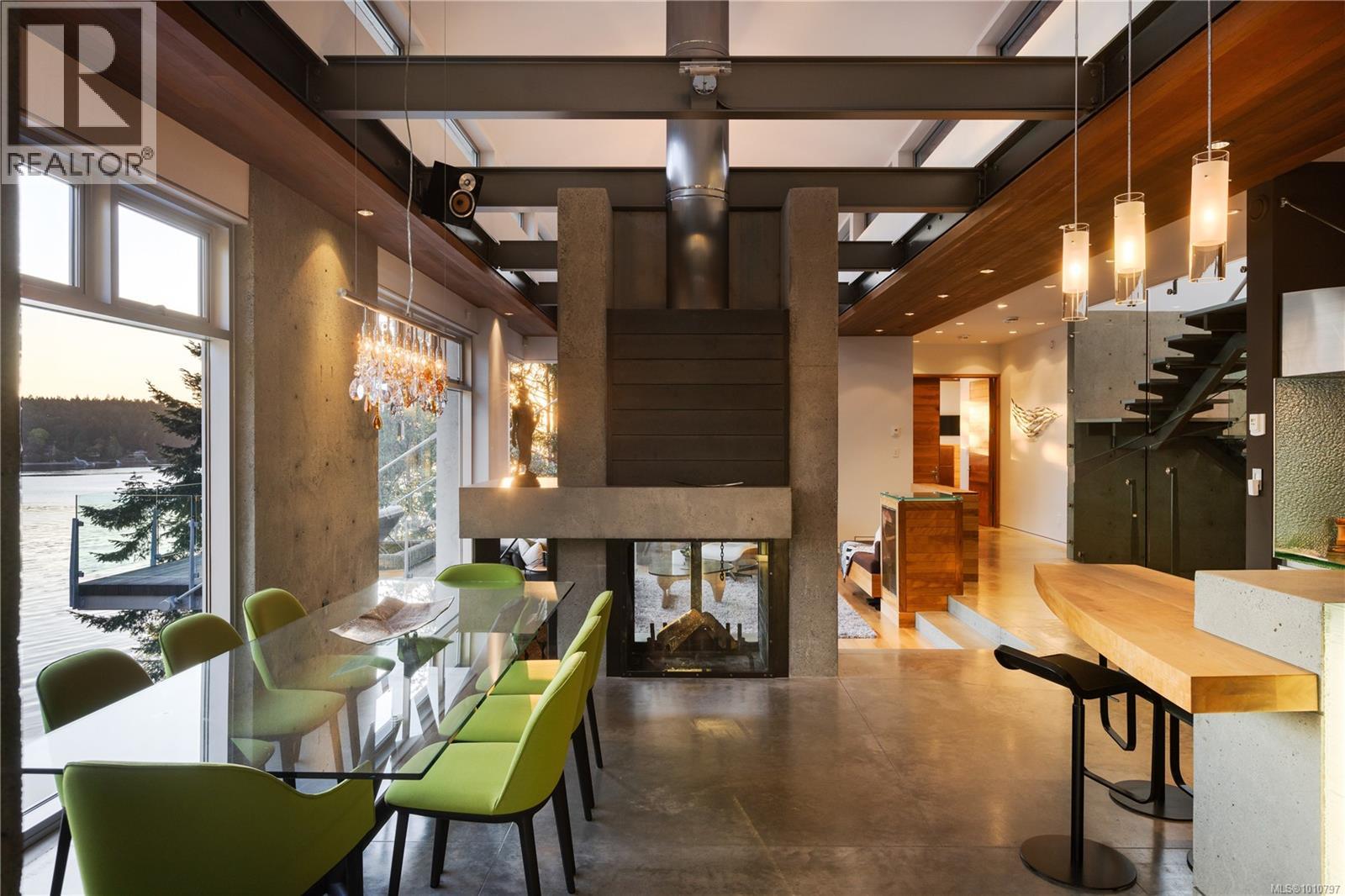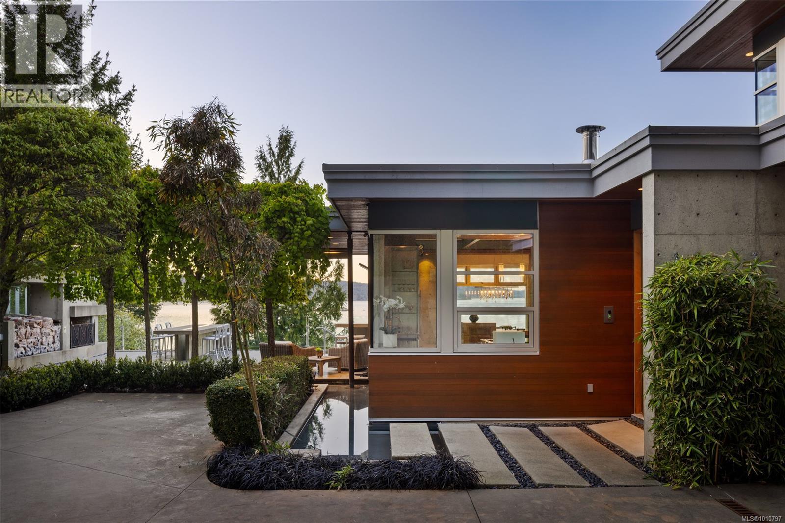 Oceanfront Masterpiece | Malibu Meets Vancouver Island. Experience a rare blend of oceanfront luxury and architectural brilliance in this custom steel and concrete estate home, set on 1.59 acres of private, landscaped grounds and 625 feet of ocean frontage. Floor-to-ceiling windows and signature porthole accents frame stunning panoramic views of the ocean, islands, and passing marine life. A bespoke flybridge extends from the living area, offering front-row views of the 82’ infinity lap pool—perfectly aligned to track the sun from sunrises over Mount Baker, to glowing sunsets on the water. Inside, sustainable geothermal heating warms polished concrete floors, beautifully paired with the rich hues of inlaid wood, floating stair rungs, and custom cabinetry. The main floor primary suite is a serene retreat with spa-inspired ensuite and sweeping vistas. The lower level offers guest accommodations, a media room, wine cellar, and a poolside gym with retractable glass doors for seamless indoor-outdoor living. Upstairs, a flexible family room or office provides a quiet escape. The kitchen opens to an outdoor BBQ area with a fireplace and concrete formed dining table. A man-made stream and modern waterfall enhance the natural ambiance. Designed by Daniel Boot, this home is a true coastal sanctuary—private and peaceful, yet minutes from shops, dining, and marinas. (id:2469)