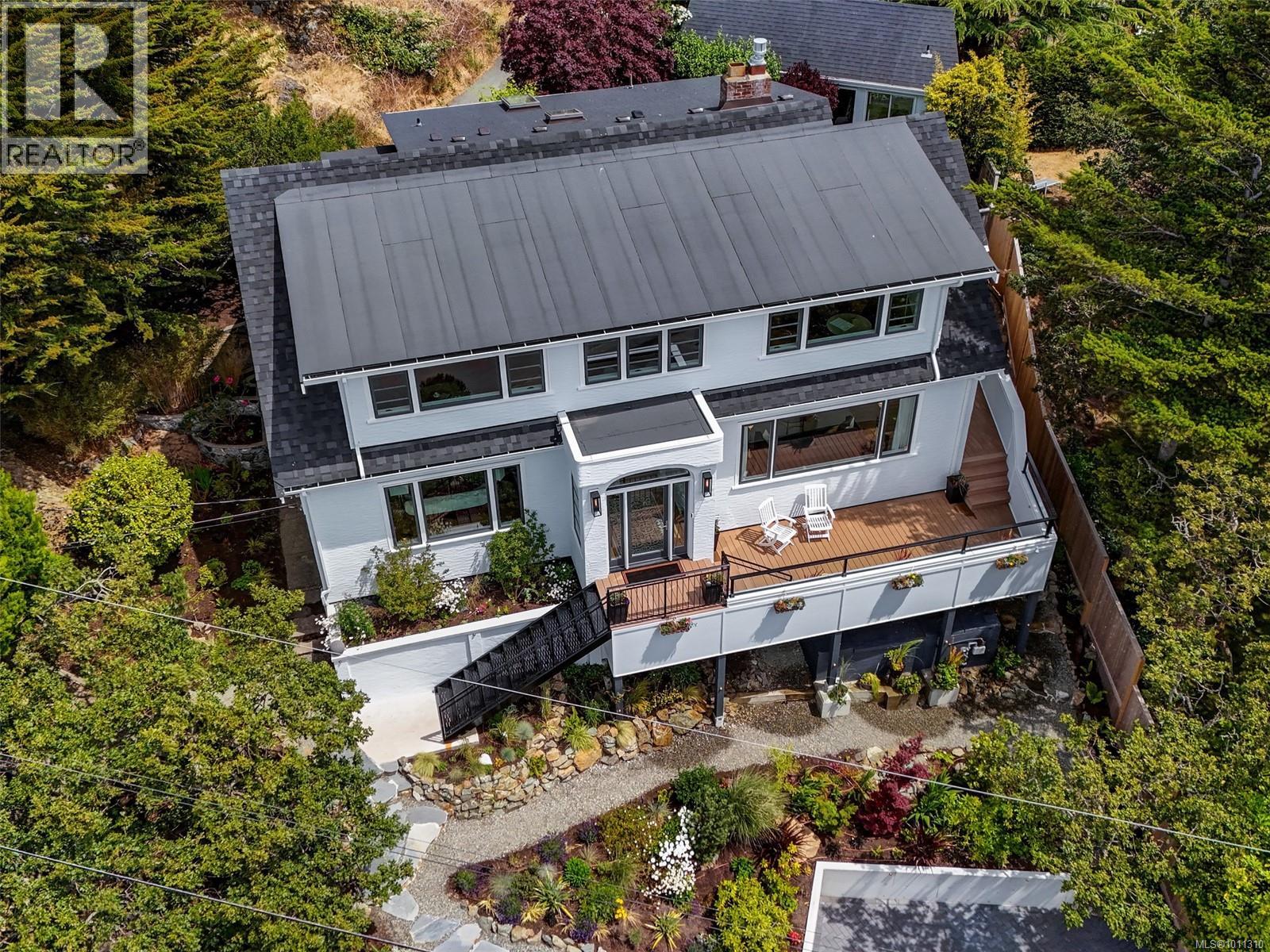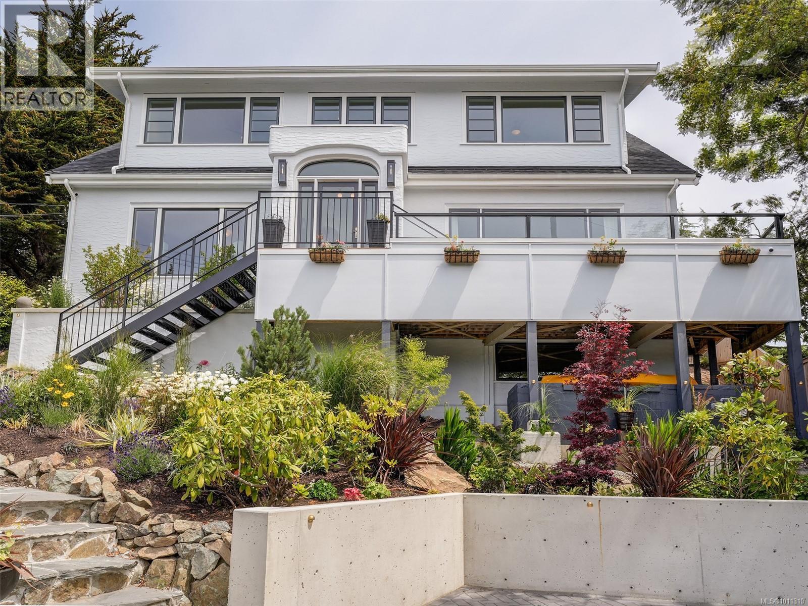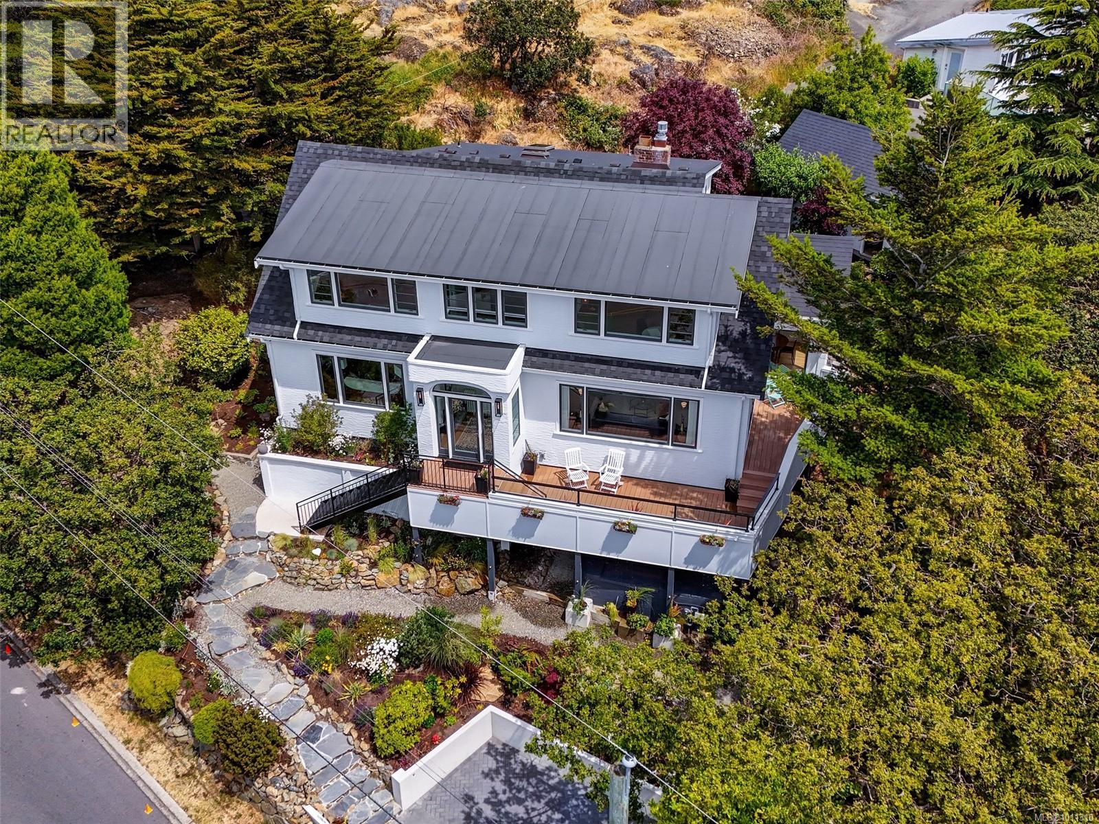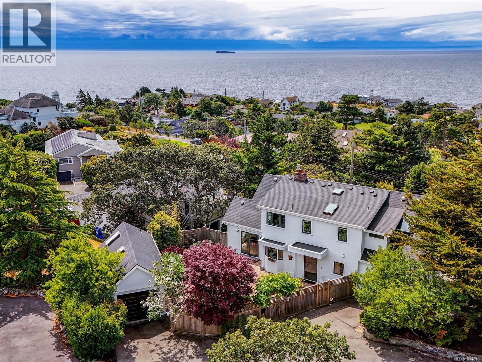 With panoramic views over the Juan de Fuca Strait and Olympic mountains, this remarkable home offers a rare combination of modern luxury, architectural character, and sought-after location. Exquisitely and thoroughly upgraded by the current owners, the new design blends timeless charm with modern elegance. The custom kitchen by Douglas Grant features marble counters, top of the line appliances and herringbone oak floors. The master suite has vaulted ceilings and a multi-room ensuite with views. French doors link the main living spaces to an ocean view deck as well as to the warm south facing rear patio garden, nestled beneath Walbran Park that naturally extends the private backyard. Tech systems include an integrated UNIFI WiFi network with ‘smart’ components, privacy-focused security and weather-aware irrigation. A short walk to Gonzales beach, this home is part of the diverse and family-focused Harling Point neighbourhood, a peaceful retreat in a world class recreational oasis. (id:2469)
