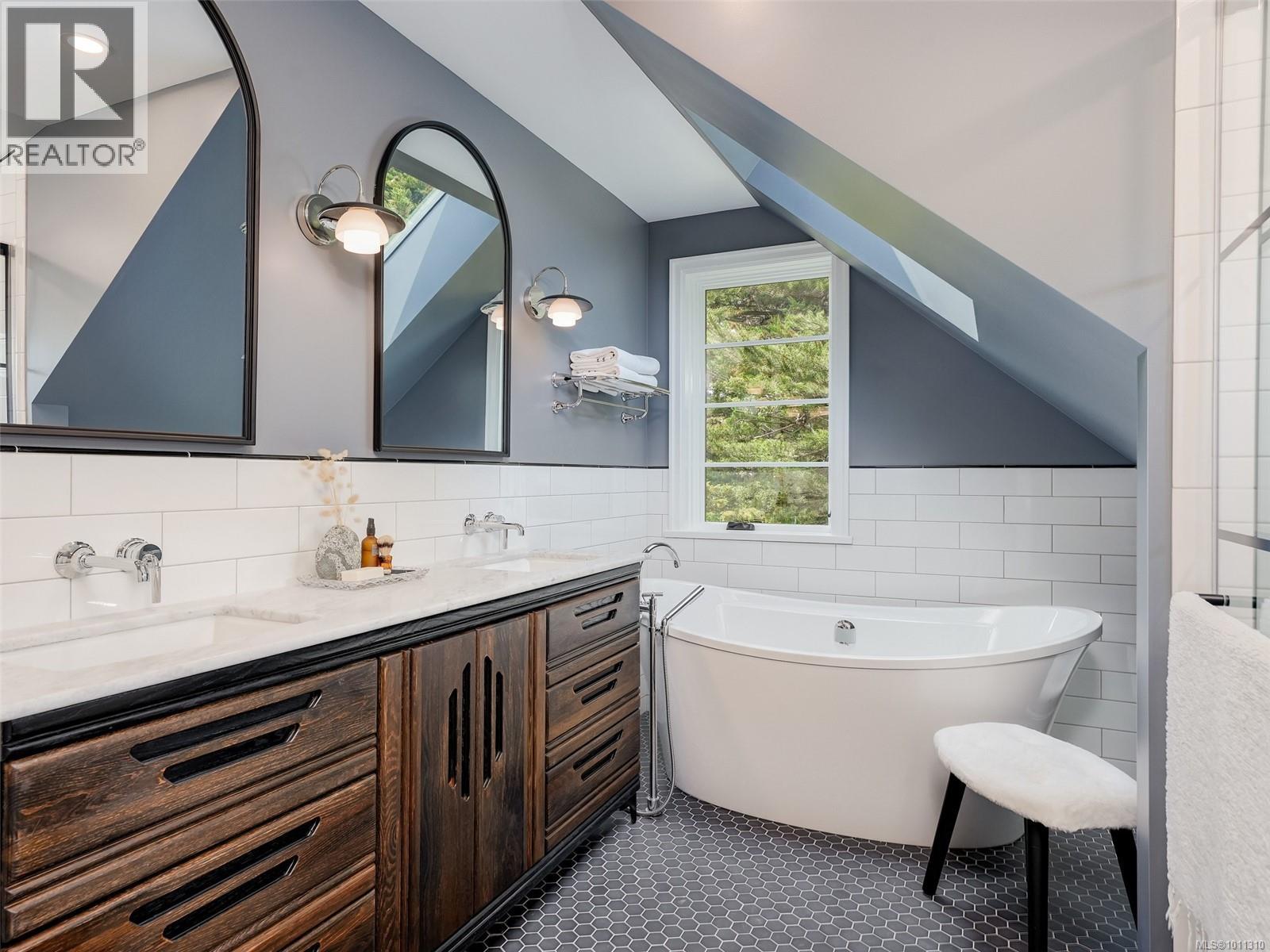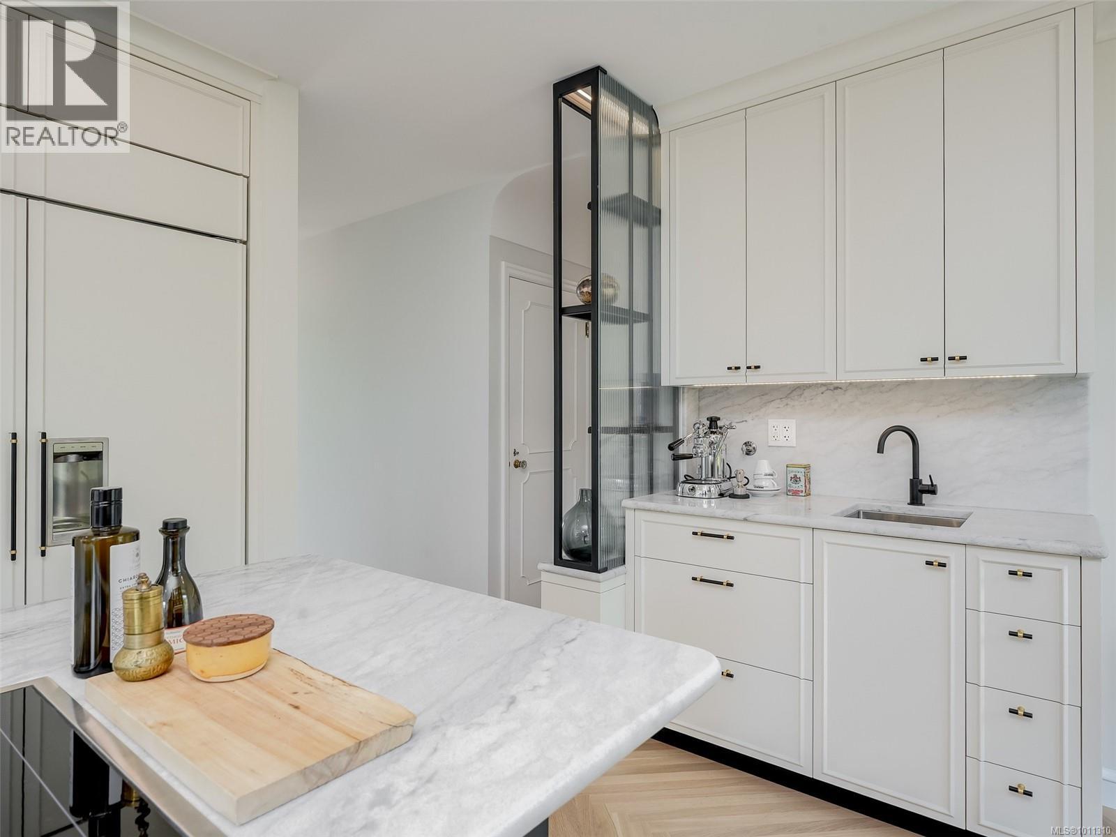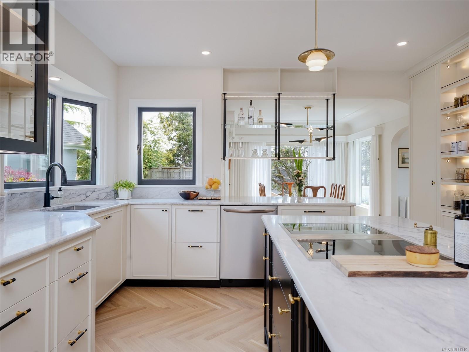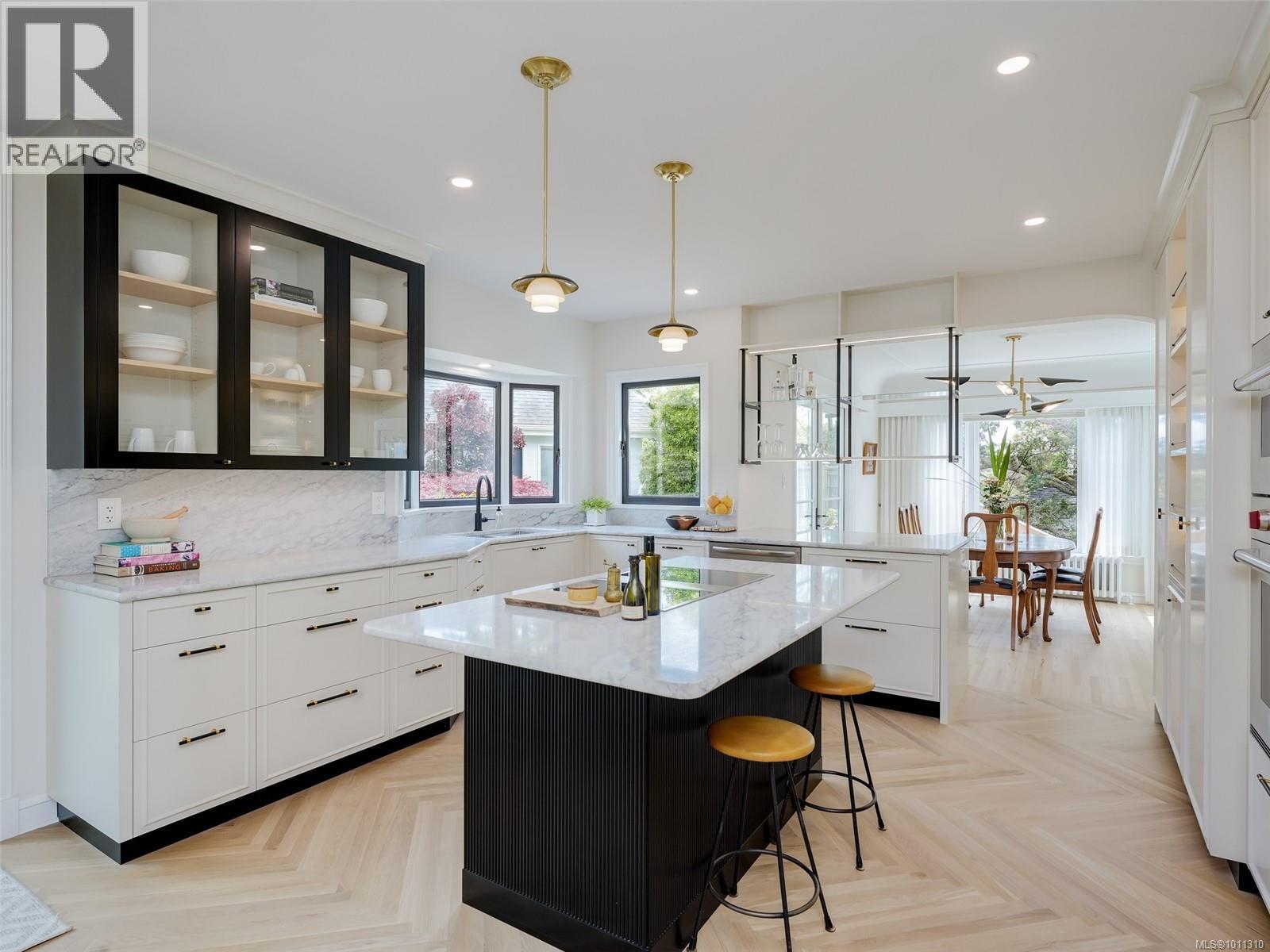 With panoramic views over the Juan de Fuca Strait and Olympic mountains, this remarkable home offers a rare combination of modern luxury, architectural character, and sought-after location. Exquisitely and thoroughly upgraded by the current owners, the new design blends timeless charm with modern elegance. The custom kitchen by Douglas Grant features marble counters, top of the line appliances and herringbone oak floors. The master suite has vaulted ceilings and a multi-room ensuite with views. French doors link the main living spaces to an ocean view deck as well as to the warm south facing rear patio garden, nestled beneath Walbran Park that naturally extends the private backyard. Tech systems include an integrated UNIFI WiFi network with ‘smart’ components, privacy-focused security and weather-aware irrigation. A short walk to Gonzales beach, this home is part of the diverse and family-focused Harling Point neighbourhood, a peaceful retreat in a world class recreational oasis. (id:2469)