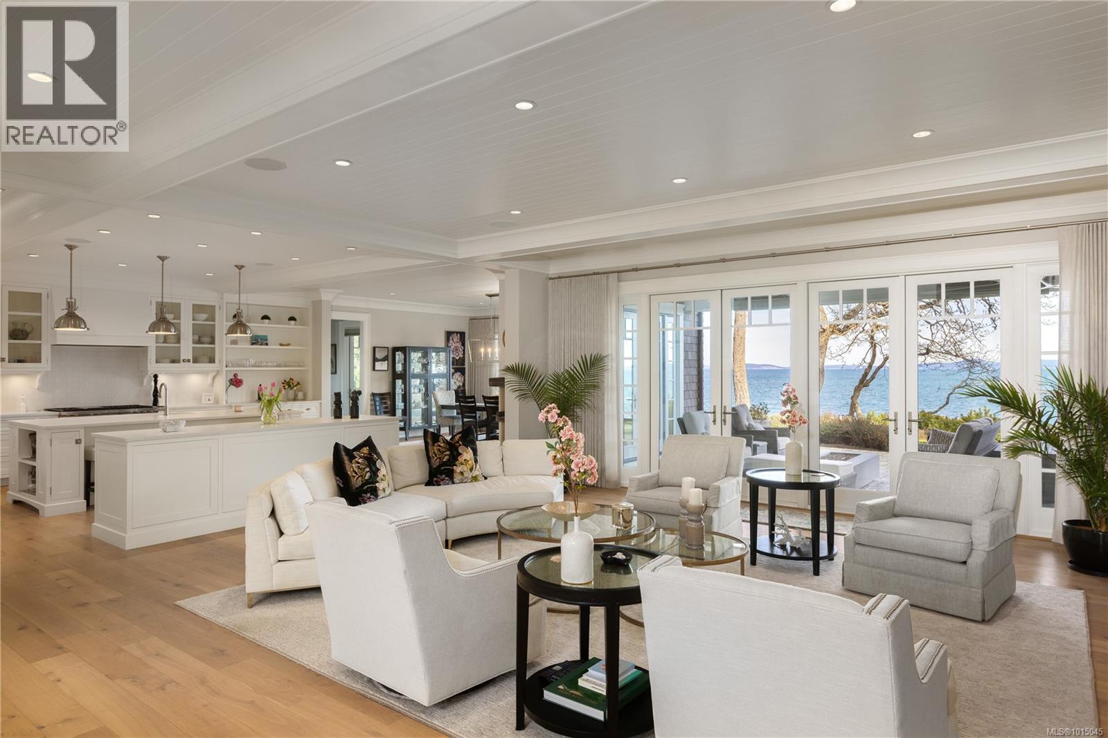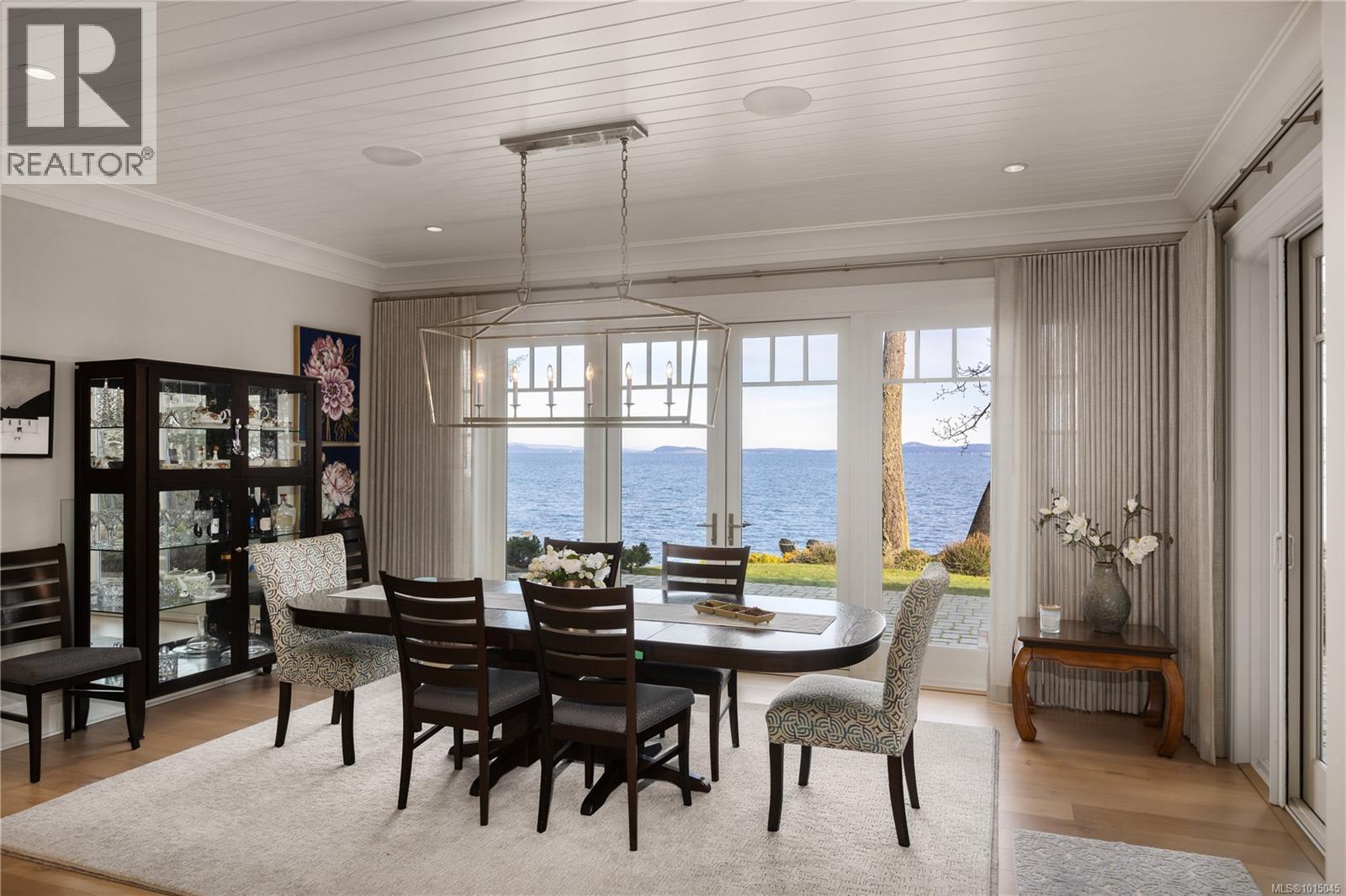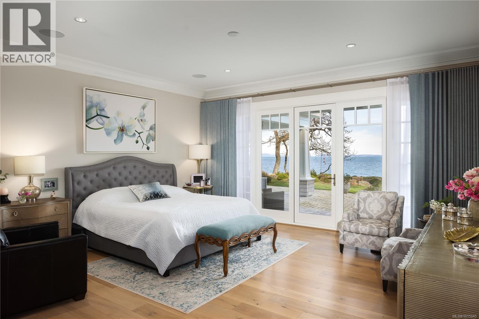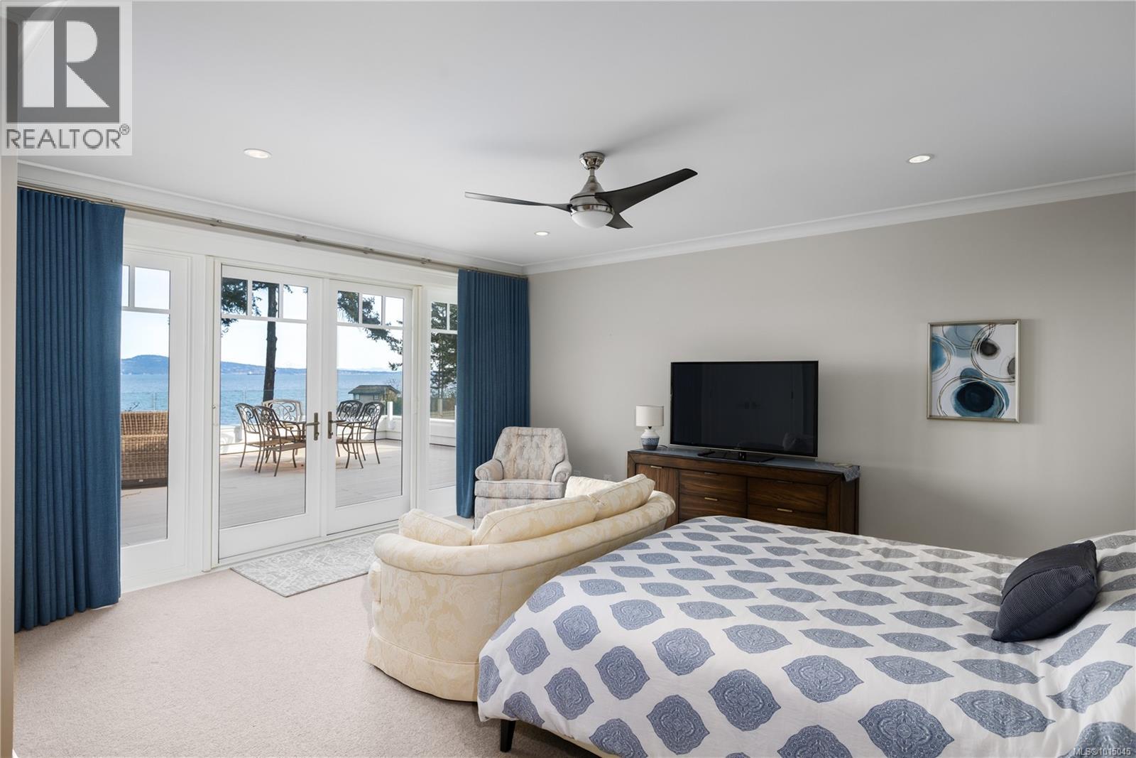Nestled down a private lane, this oceanfront residence offers modern coastal design & luxurious living. With unobstructed views of the ocean & Mt Baker, the home is set amidst a landscaped garden, complemented by a paver driveway. Inside, white finishes, light oak accents & chrome detailing create a bright, inviting atmosphere, while the light oak flooring and abundant natural light enhance the home's warmth. The spacious living room, complete with a cozy fireplace, opens to a private patio that invites indoor-outdoor living & stunning ocean views. The soaring 9'6'' ceilings are accented with crown molding throughout, creating a sense of grandeur & space. The exquisite chef's kitchen features a double island, butler’s pantry & sleek Wolf gourmet appliances, including two fridges and a freezer, built-in microwave, and dishwasher, offering both convenience and sophistication. The main-floor primary bedroom serves as a peaceful retreat, boasting a 250 sqft walk-in closet and an opulent 5-pc ensuite bathroom with a separate toilet for privacy, along with direct access to the patio. Upstairs, 2 spacious bedrooms each feature ensuite bathrooms, walk-in closets & decks with ocean views, while a second living room, second laundry room, a nanny suite & addl 3pc bathroom complete the upper level. The lower floor is designed for leisure, offering an exercise room, media room, and games nook. This residence includes a spacious double garage, a versatile study room that can easily be converted into a bedroom, and a tucked-away laundry room. Geothermal heating provides year-long comfort in every room. Situated on a small bay, the property is protected from harsh weather while offering ocean access, perfect for paddleboarding or canoeing. Along with a home warranty expiring July 2030, the property is sheltered with a decorative black fence & front gate. Just minutes from parks, shops, schools, UVIC, and Cadboro Bay Village, this is refined coastal living at its best. (id:2469)