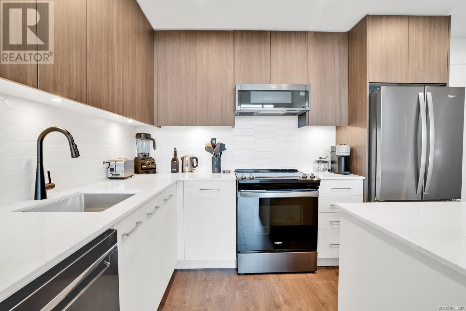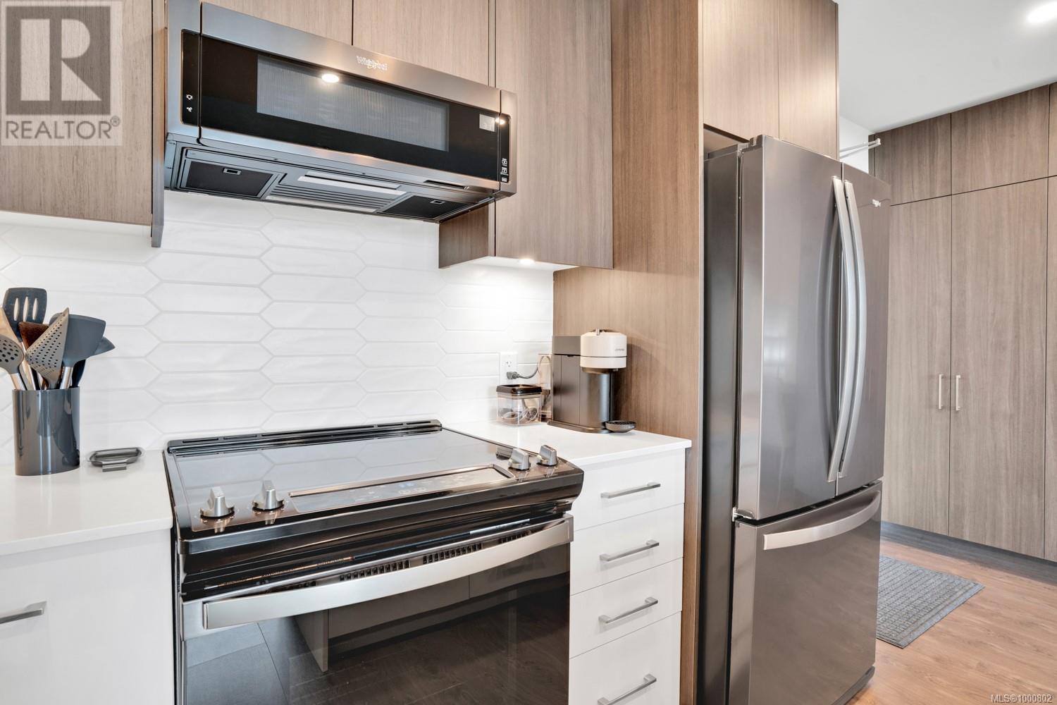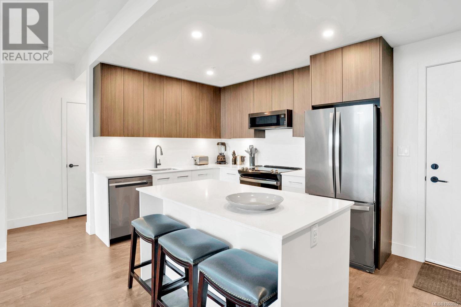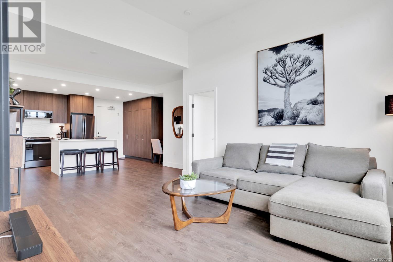 Welcome to 531–920 Reunion Avenue, a bright and modern top-floor condo in Langford’s award-winning Belmont community. This 2-bedroom, 2-bathroom home offers nearly 1,000 square feet of thoughtfully designed living space with elevated ceilings and large windows that fill the unit with natural light. The layout is ideal, with bedrooms on opposite sides for privacy, a dedicated office nook, and an open-concept main living area that feels spacious and inviting. The kitchen features full-height cabinetry, stainless Whirlpool appliances, quartz countertops, and a large island perfect for entertaining or casual meals. The primary suite includes a walk-through closet and a spa-inspired ensuite with double vanities and a frameless glass shower, while the second bedroom is bright and comfortable with its own full guest bath nearby. Step out onto your private covered balcony with treetop views and a gas BBQ hookup—perfect for evening relaxation. This pet- and rental-friendly unit includes full-sized in-suite laundry, a large pantry wall for storage, one secure underground parking stall, and a separate storage locker. Reunion’s amenities are among the best in the Westshore, including a stunning fireside lounge, a chef’s kitchen and social room, a fitness centre, an outdoor BBQ terrace and fire pit, a fenced dog run, and a modern dog wash station. Located across from Belmont Market and Westshore Town Centre, and just steps to the Galloping Goose Trail, you’re within walking distance to groceries, cafes, dining, fitness studios, and more. With lakes, parks, and Bear Mountain just minutes away, this is a prime opportunity to live in a stylish, connected, and community-driven setting. This is a must see. Book your viewing today. (id:2469)